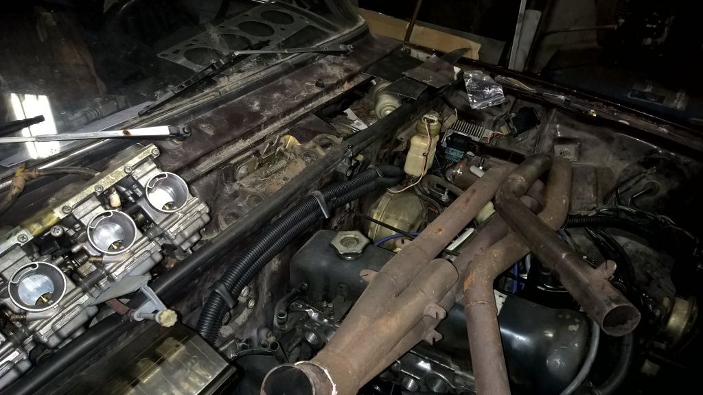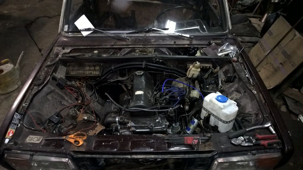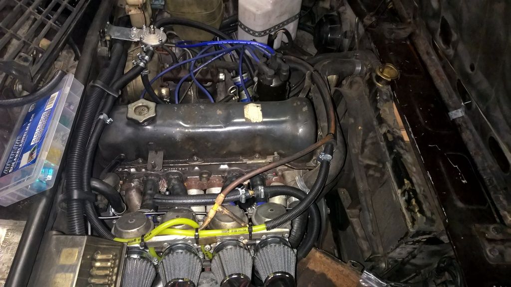 Noniin elikkäs viime yönä kävi se hetki kun alettiin iivanaa starttaamaan. Tultiin siihen lopputulokseen että nyt pitää alkaa repimään axtekista tankki irti ja samalla vetästä polttoaineen paluuputki myös tankkiin. Tässä ruskeassa ei näkynyt paluupuolta olevan. Auto hörähti saman tien iloisesti tulille kun saatiin tarpeeksi polttoainetta kaasareiden kohoille. Samassa tuli huomattua että kun vääntää avaimesta sammuksiin niin auto jää käytiin. Epäilen suuresti että laturin kytkennät ovat väärin. Pitää vielä tänään käydä hakemassa 38 mm silikoniletkun pätkiä, kirkasta 8 mm polttoaineletkua, diodi töistä ja alkaa penkomaan vanhojen projektien ylijäämäosia jos mulla ois se paineensäätäjä jossain varastonhyllyllä. Nyt tuli kummasti motivaatiota kun toveri ruski hörähti tulille