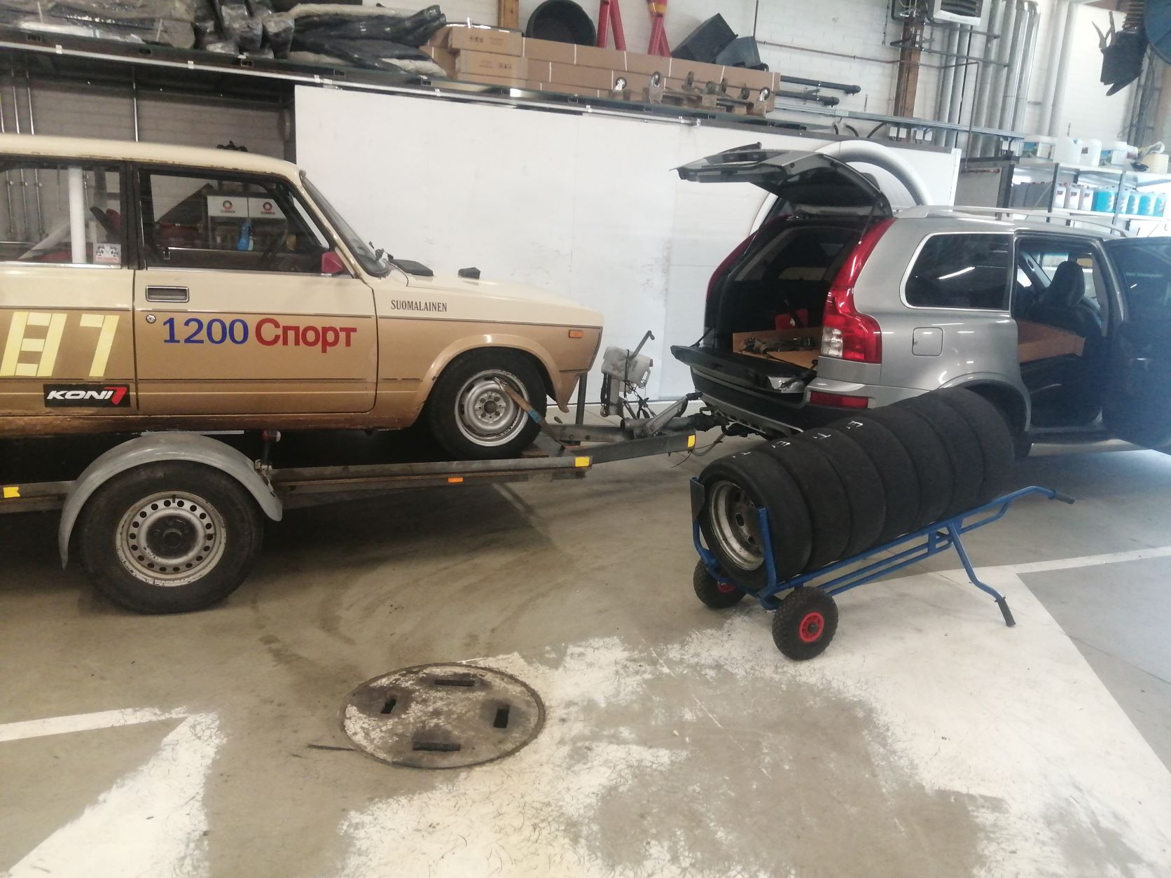Tässä kuva ajon jälkeen kun vaihdettiin siirtopyöriä alle. Elikkä nyt Atelle täydellinen synninpäästö nopeasti kuluneista paloista, silloin oli Timo kakkoskuskina ja nyt ajoin yksin elikkä Timo se on joka jarrut kuluttaa (hi hi).