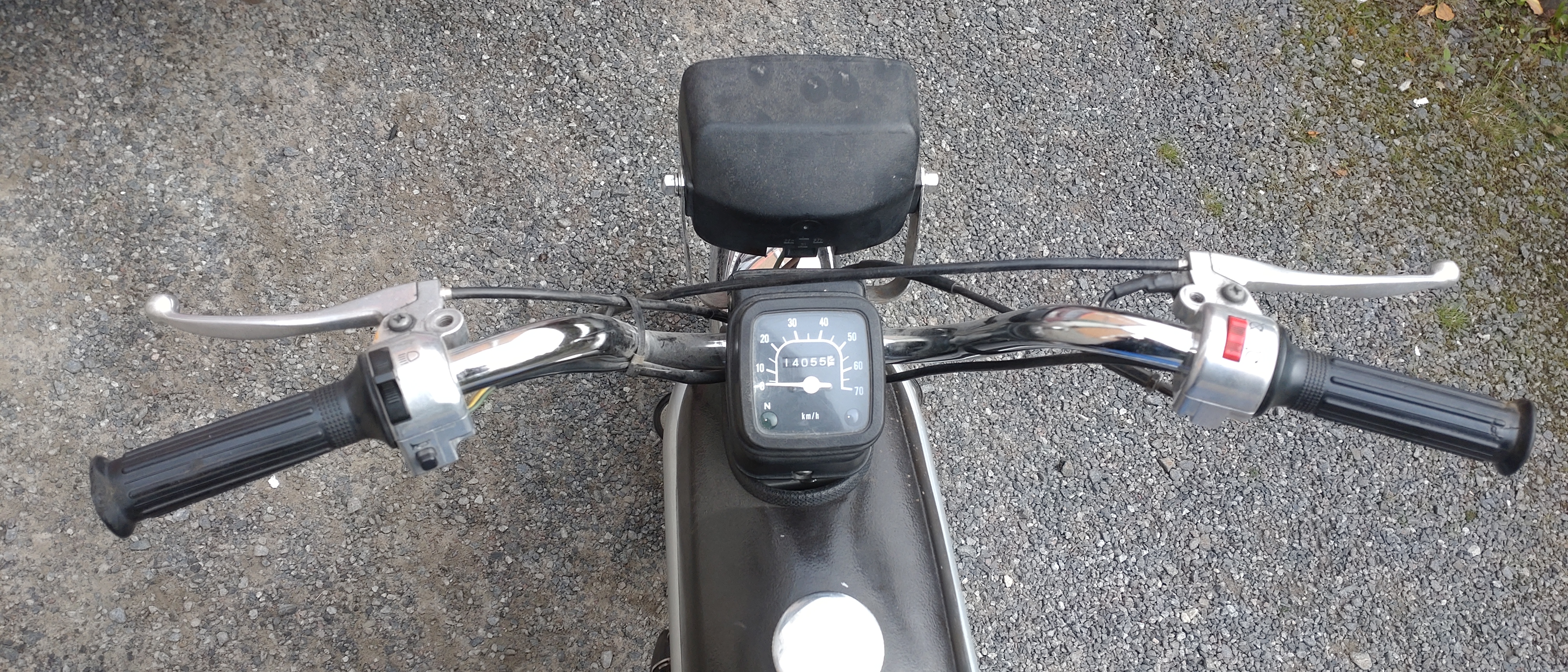 Luonnollisesti tässä on 12 voltin sähköt ja tuoreöljyvoitelu. Ne ovat jo 1998-vuosimallissa, mutta akku puuttuu niistä. Tässä yksilössä on alkuperäinen akku, mutta se on täysin kuollut. Täytyy siis hommata uusi. Samoin renkaat ovat vaihtokunnossa. Mopoon on tehty koneremonttikin viime vuonna, eikä sillä ole ajeltu sen jälkeen mainitsemisen arvoista määrää. Se käynnistyy ja toimii, kun koeajoin sen. Tekniikka on täysin vakio tässä, mikä käsittää 50 cc täysläppäpytyn, 14 mm Mikunin kaasuttimen sekä vakion ilmansuodattimen ja täysin ehjän vakioputken.