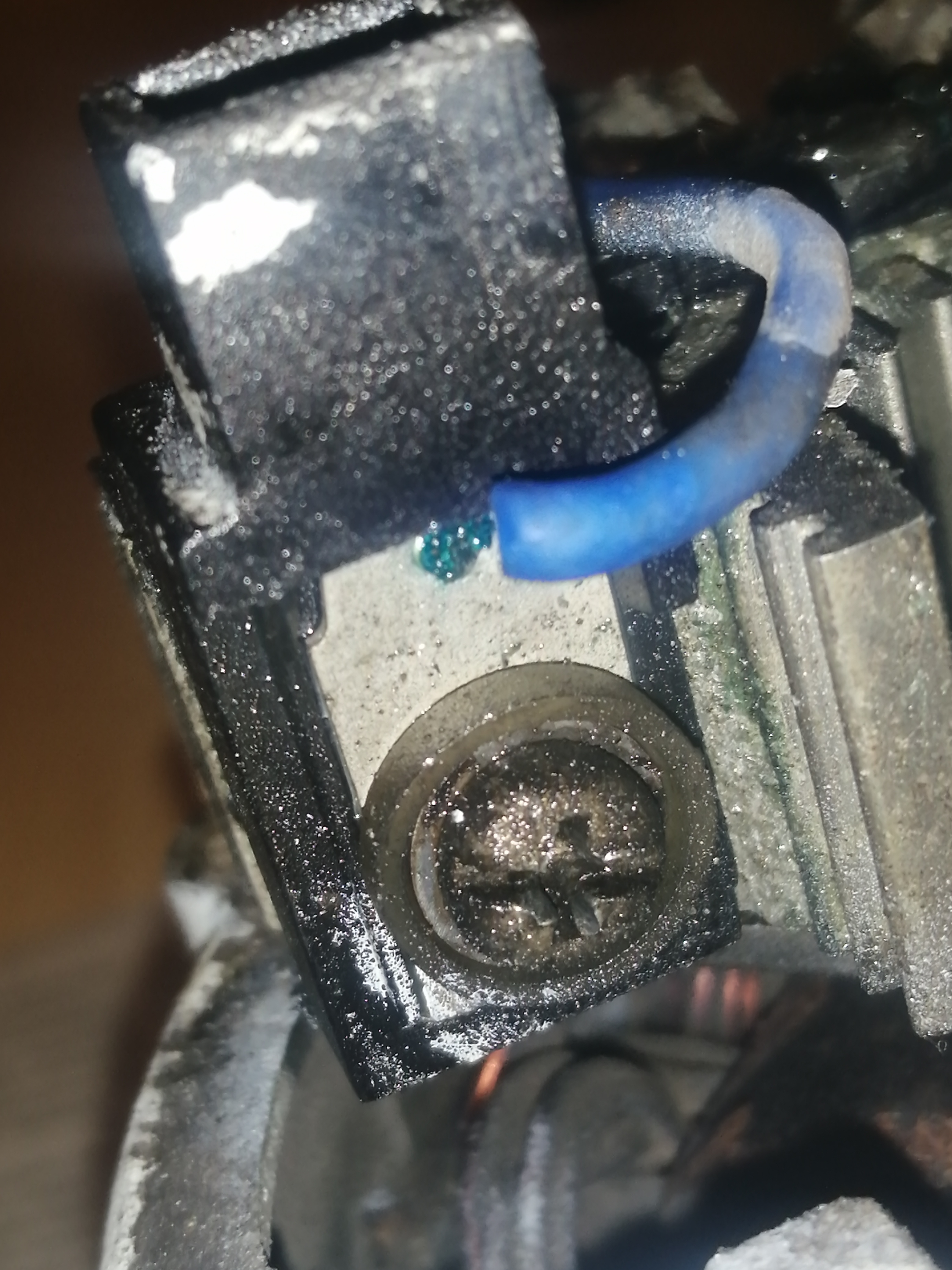 Laturia päästy sipistelemään. Hiili vaihdettu ja hiilen jousta (joka oli sulanut pitimeen) venytetty. Näiden toimenpiteiden jälkeen testattu ettei lataa. Lisää mittauksia ja todettiin herätevirtaliittimen johto hapettuneen myös poikki, siis laturin sisällä oleva. Johto näytti olevan hyvin paikallaan mutta kun sitä väänsi niin irtosi ja kuoriessa paljastui puolisenttiä vain vihreää tuhkaa...