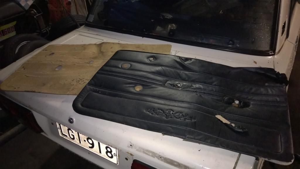 Sisusta purettu axtecista ja samalla alettu mallaileen sitä tuohon vanhempaan lataan. Sisusta oli aivan priima poislukien vänkärin ovipahvi joka oli saanut hieman kosteutta itseensä ja mennyt aivan haperoksi. Nyt pitää alkaa metsästään uus ovipahvi tuohon tilalle