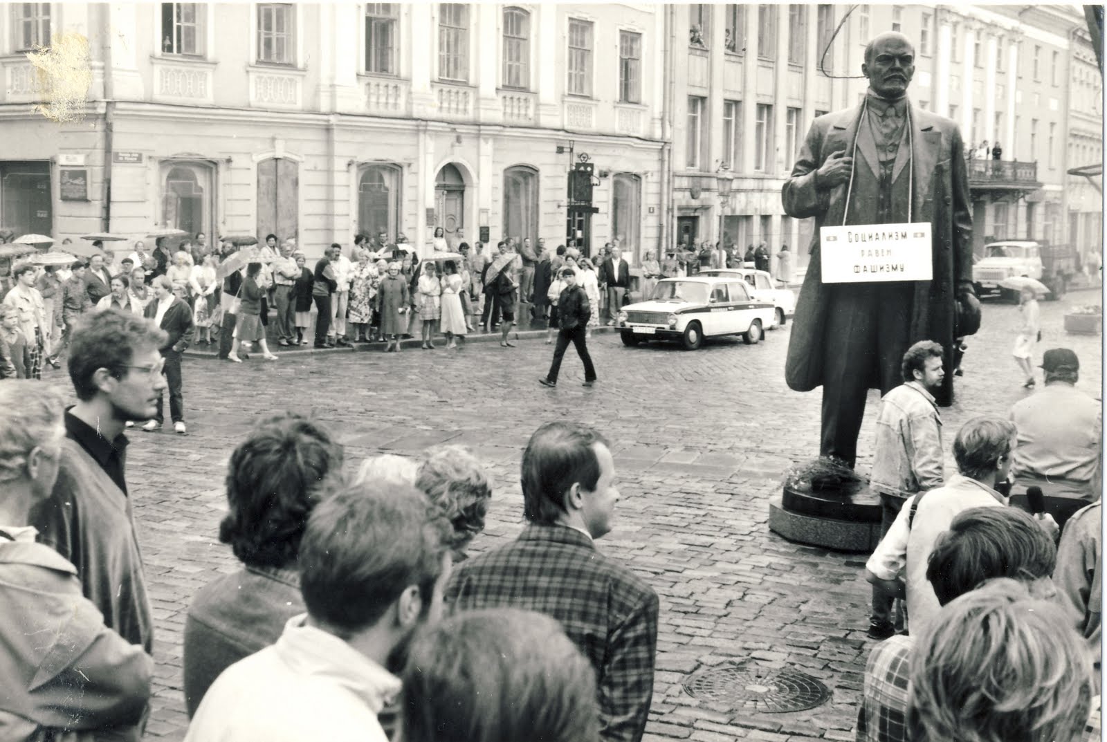 Patsas seisoi vielä v. 90-alussa kaupungin parhaalla paikalla Riianmäellä, josta se poistettiin 23.8.1990, kaulassa roikkuu teksti "sosialismi on samanlaista kuin fasismi".