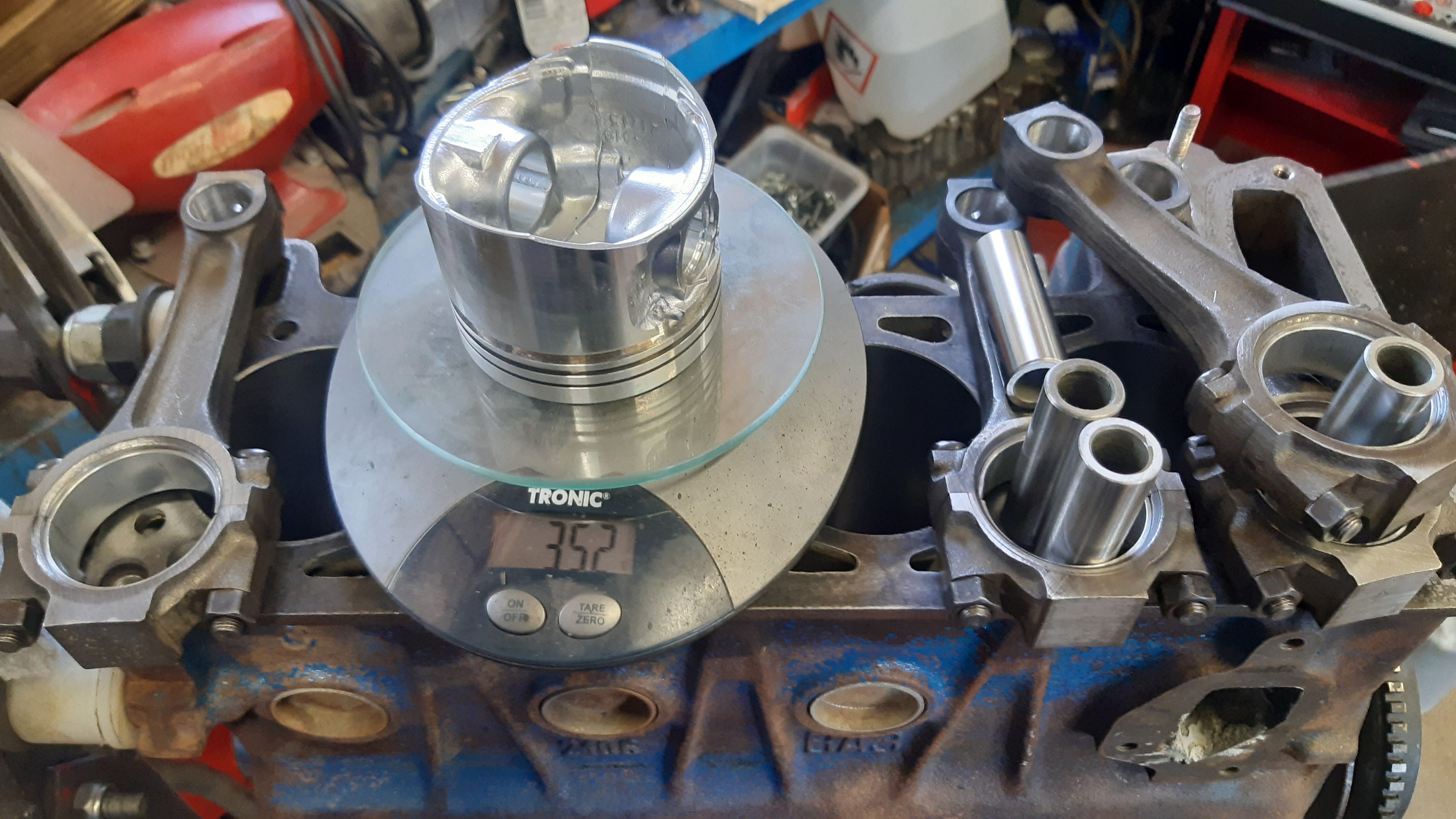 Tuossa muuten vertailuks opelin 1,8 pikkulohkon mäntä/veivi paketti ladan kamojen vieressä. Vain puoli kiloo painoeroa