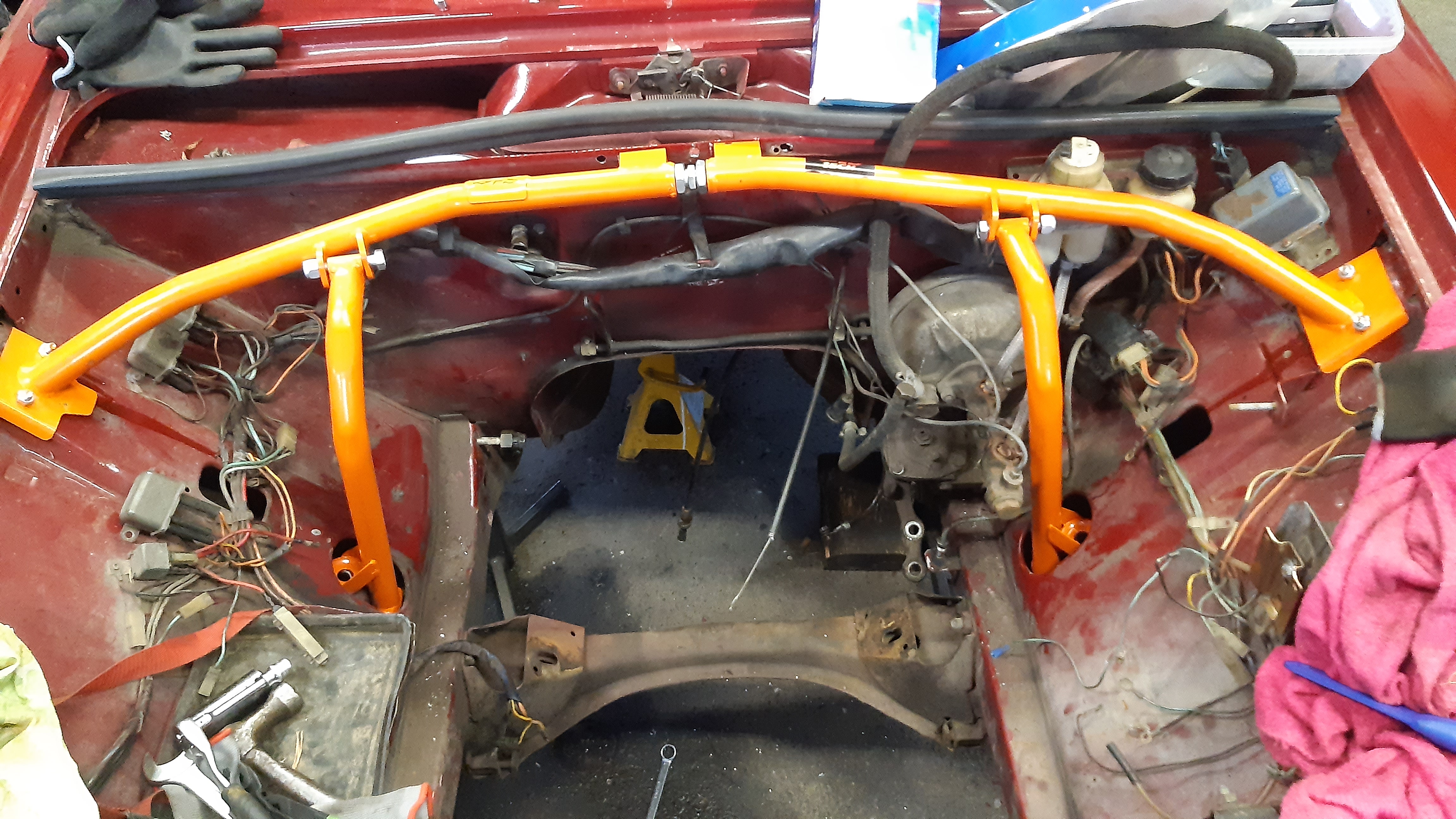 No jotaki saatu aikaseksikin, tuo moottoritilan tuki kävi aika hyvin paikalleen. Hitsasin noihin kotelon sisään tuleviin käikäleisiin korilaatat, nyt tukee hyvin palkin takaosaanki. Konepellin tiivisteen kohalta pulttaan kaaren koriin kiinni parilla kapeella lattaraudalla.