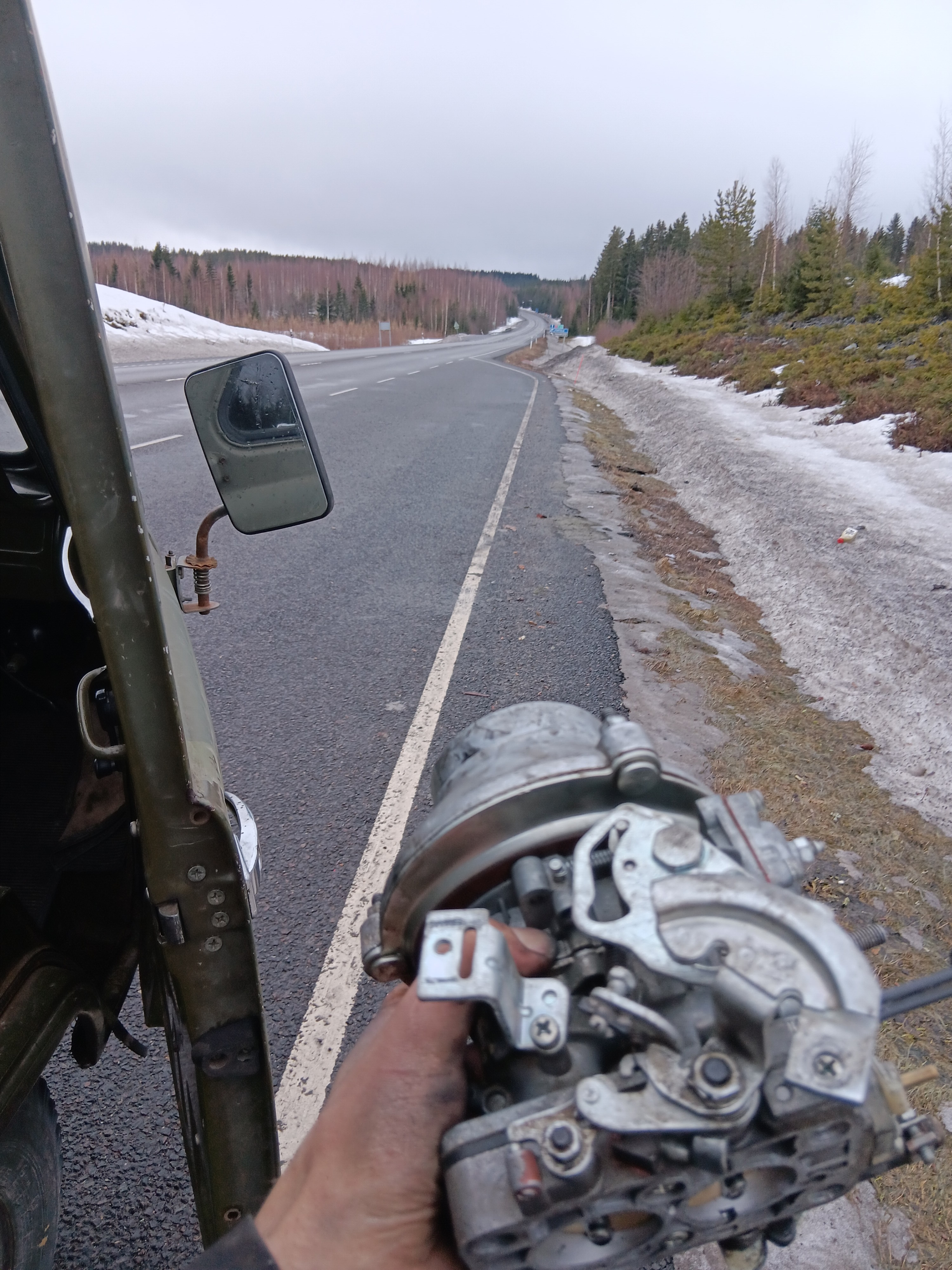 Eilinen oli ensimmäinen varsinainen koeajopäivä ja otin auton liikennekäyttöön. Joku 150km tuli ajeltua ja ainakin moottori uudella kaasuttimella toimii tosi hyvin. Tuli hyvä maasto ja kaupunkiajoon, vääntää tosi alhaalta, nelosvaihteella pääsee ajamaan 40-50kmh ja liikenneympyrätkin tarvittaessa kolmosvaihteella. Hieman ehkä maantievauhdissa vetoja puuttuu, että jotain suutinta voisi yrittää isontaa.