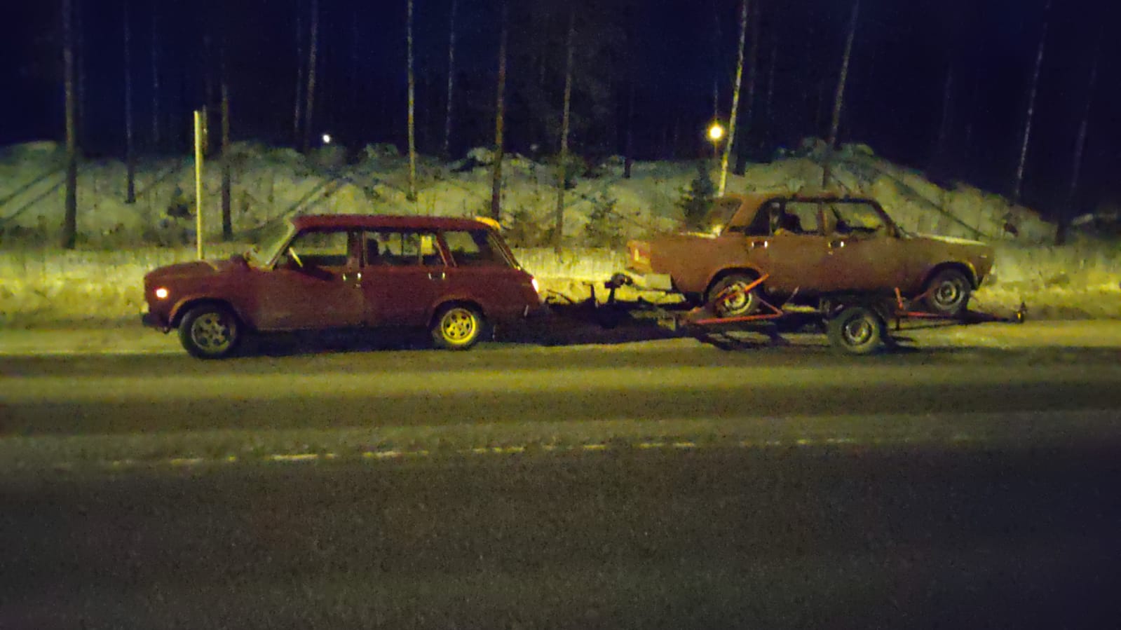 Kävipä nyt sitten niin, että 14.1 hakiessani uutta uljasta 1500SL-menopeliäni Liperistä sattui ensimmäinen tielle jäänti. Menomatka sujui ongelmitta, mutta paluumatkalla huomasin jossain Suonenjoen paikkeilla valtatiellä 9 kello 23, että latausmittari näyttää 12 volttia ollen vihreän ja valkoisen rajalla. Latausvalo ei syttynyt. Havaittuani asian sammutin radion ja muut tarpeettomat laitteet sekä siirryin sähkönsäästöajoon. Pääsin Hankasalmen Jari-Pekkaan, jossa ei harmi kyllä ollut akkuja myynnissä. Jossain huoltoasemilla on ainakin joskus ollut akkuja. Lähdettyäni siitä kohti Jyväskylää alkoi latausmittarin viisari laskea uhkaavasti kohti punaista. Seuraava auki oleva liikenneasema olisi ollut Vaajakosken ABC. Pääsin muutaman kilometrin päähän ABC:stä, kun ensin hiipui valojen merkkivalo ja sen jälkeen Lada nykäisi ja silloin meno loppui. Onnistuin melkein rullaamaan bussipysäkille, mutta koska perässä oli traileri ja Lada sen päällä ja liukastakin oli, menin pari metriä pitkäksi, mutta kuitenkin tien reunaan eikä keskelle. Otin 1500SL:stä akun, mutta siitä ei hyötyä ollut kuin se, että saatoin käyttää hätävilkkuja. Matkaa perille olisi ollut vielä 200 km. Onneksi minulla on kaskovakuutus, joten soitin 24h-akkupalveluun ja tilasin sieltä kameraadin tuomaan uutta akkua. Odottelin reilun tunnin, kun hinausauto saapui ja ostin hetimmiten kaksi täyttä akkua, 60 ja 70 ampeeritunnin akut. Asensimme tuon 60 Ah akun ja matka jatkui sähkönsäästölinjalla. Aloin ajaa määrätietoisesti kohti Tamperetta pysähtymättä enää mihinkään. Tein kaikki mahdolliset temput sähkön säästämiseksi, ja vihdoin viimein Tampereen moottoritie avautui. Siinä vaiheessa latausmittari oli valkoisen ja punaisen rajamailla. Vein trailerin Ladoineen sinne minne se kuului ja pääsin lopulta Hervantaan. Viimeisten liikennevalojen kohdalla jännite akussa oli enää pari milliä punaisen alueen alalaidasta, samoilla tonteilla kuin silloin kun jäin Vaajakoskella tien varteen. Viimeisillä voimillaan Lada jaksoi parkkiruutuun asti. Silloin kello oli 5.25 aamulla. Täydellä 60 AH akulla pystyi siis ajamaan yksipisteruiskuladalla 200 km. Tämä on hyvä tieto tulevaisuutta ajatellen.