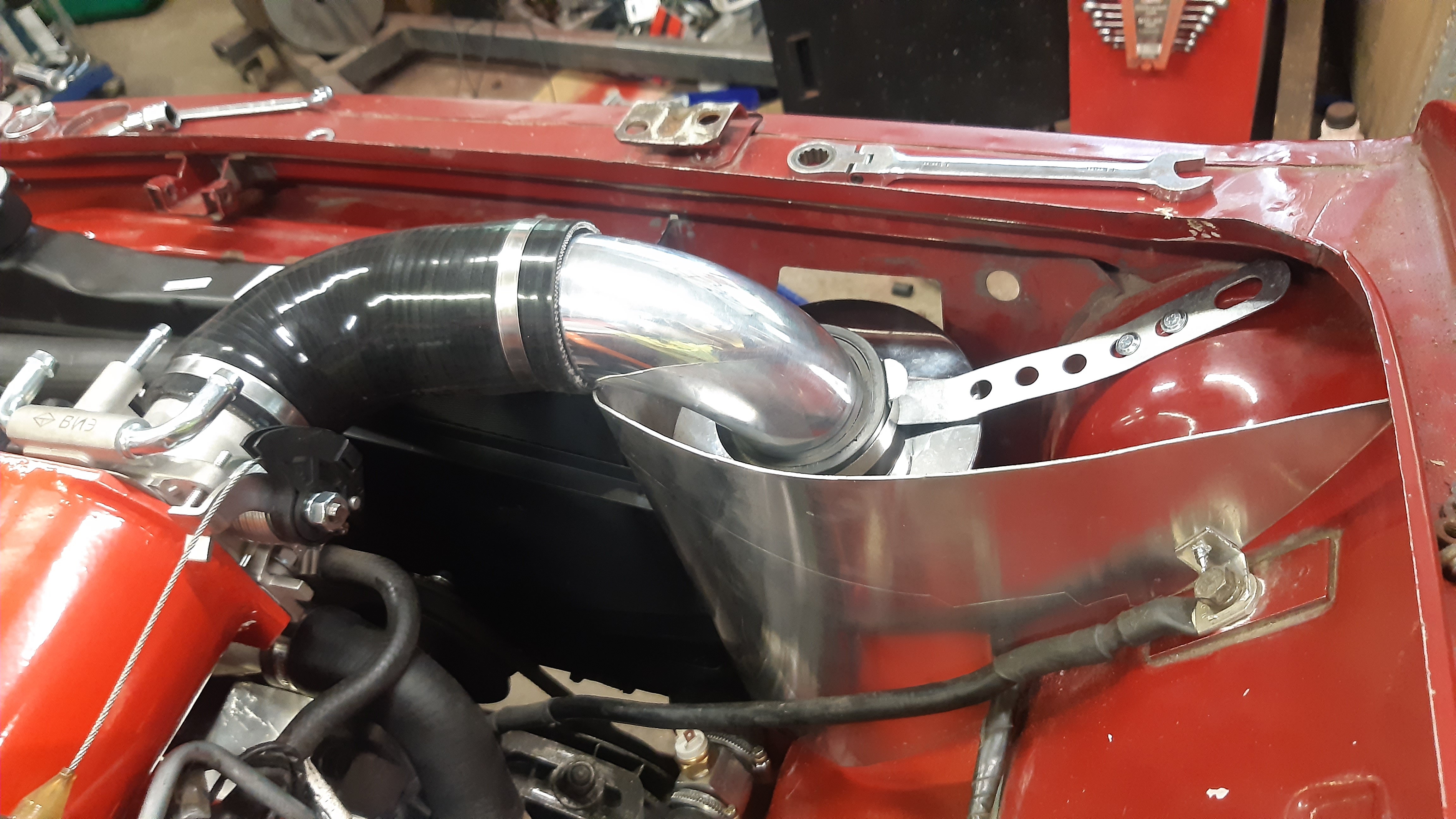 Termostaatti, letkuja ja piuhoja asennettu. Montaa kohtaa on joutunu enemmän tai vähemmän muokkaamaan/säätelemään hi-performassin alttarilla😂
