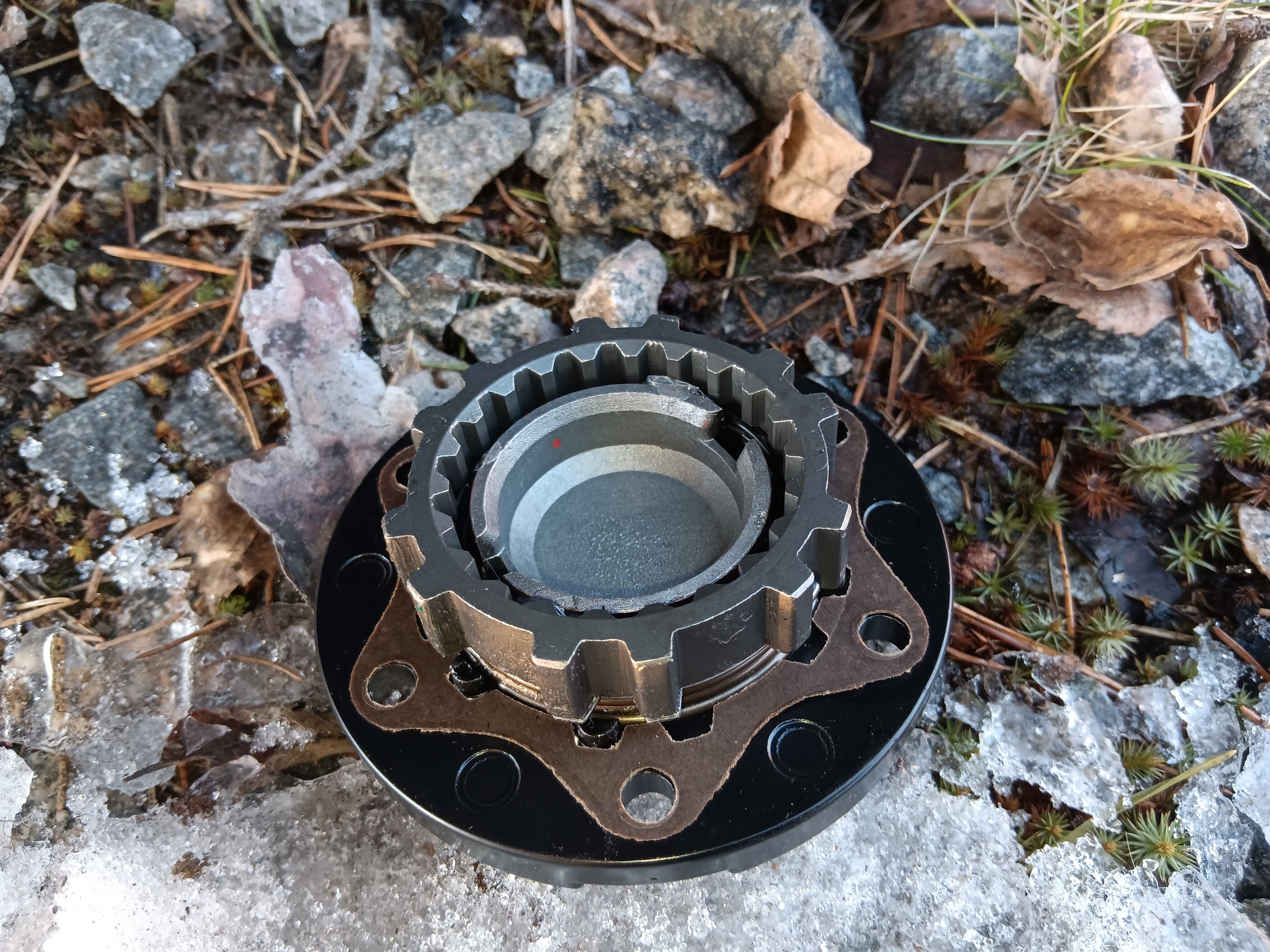 Taka-akselin rakenteesta johtuen tiivistepaperin paksuus vaikuttaa hammaskosketukseen ja kai laakerivälykseenkin, joten kun alunperin oli tosi ohut tiivistepaperi niin kasattiin nyt pelkällä tiivisteliimalla ohuiden tiivistepaperien puutteessa, kun arveltiin osuvan tarpeeksi lähelle.