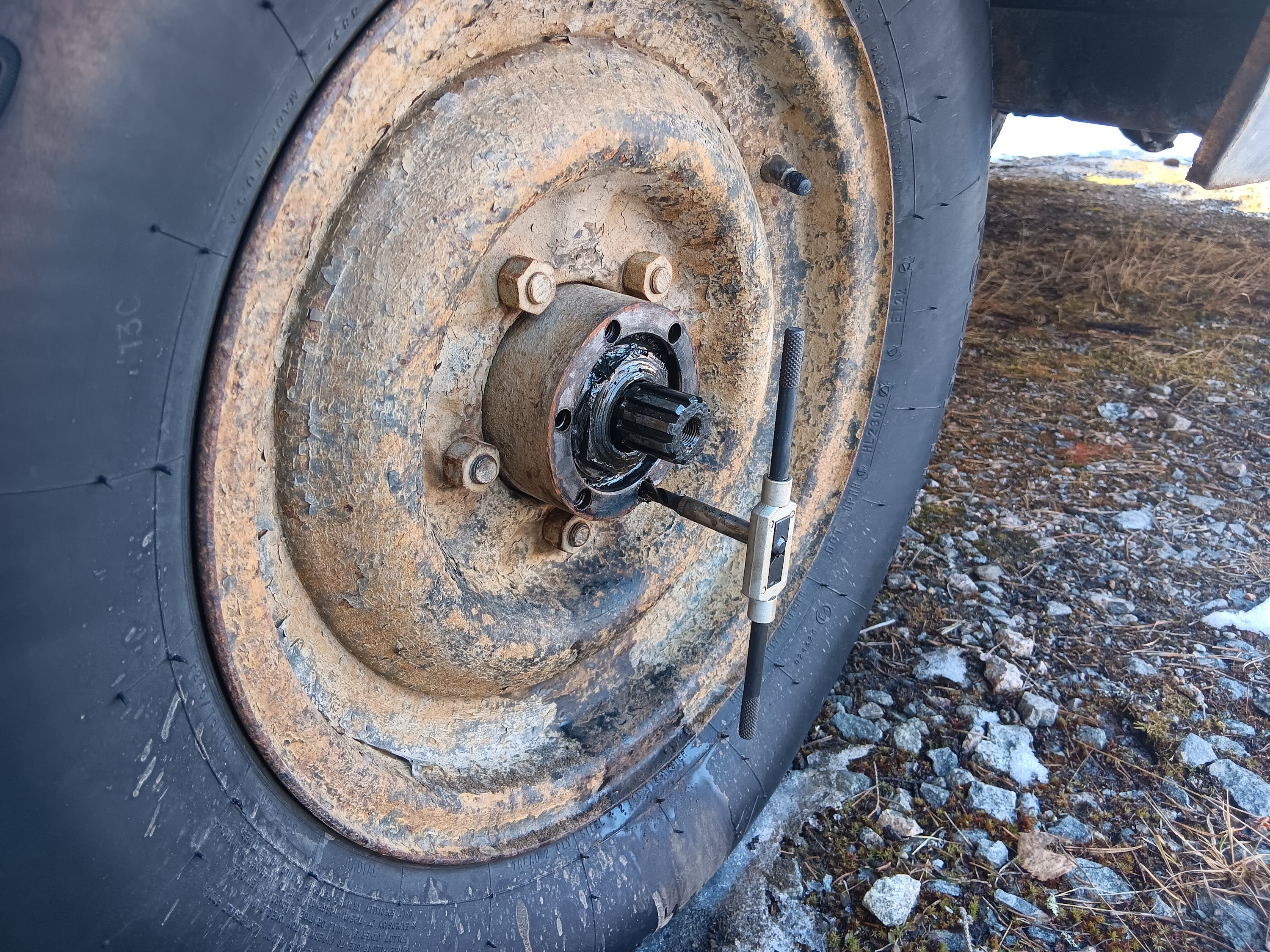 Orkkista irrotettaessa lähti yhdestä pultista kierteet. Kierretapilla sai pelastettua navasta kierteet, että ei tarvinnut kuin etsiä uusi M10 pultti. Paitsi että halusin että on kaikki samannäköisiä ja tässähän oli pultit 14mm kannalla, joita ei pulttikaupastakaan löytynyt. Vakio 17mm kanta on siinä ja siinä että onko niin iso että ei mahdu rengas pois, vaan ahdistaa keskireiästä pultinkantoihin, joten hankin sitten kuusiokolopultteja.