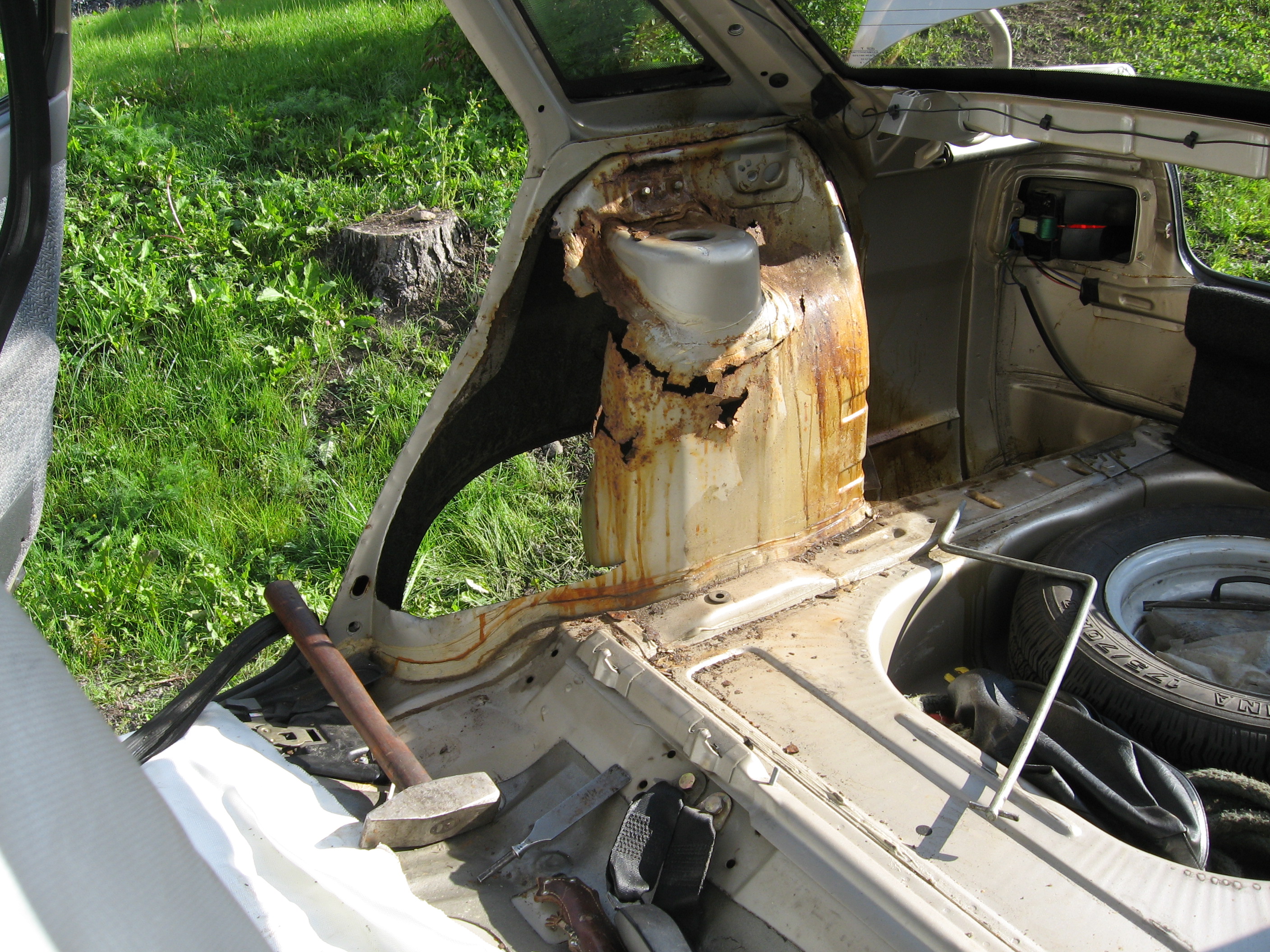 Piti ruostelaikut poistaa ja fiksata auto yksiväriseksi. Takapäästä löytyi tälläinen yllätys (ehdotuksia mitä voisi tehdä):
