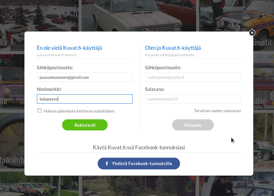 HUOM! Mikäli et halua rekistöröityä palveluun, voit pyytää ylläpidolta myös pääsyn pelkällä salasanalla tiedostojen lisäämistä varten. Otathan huomioon että tällöin kuviin ei tallennu lähettäjän nimeä etkä voi poistaa itse siirtämiäsi kuvia. Voit tällöin nimetä tai pyytää ylläpitoa nimeämään kuten vanhasta ladagalleriasta siirretyt kuvat eli alkuun kuvaajan nimi esimerkiksi ladapaavo__IMG5618.jpg muotoon.