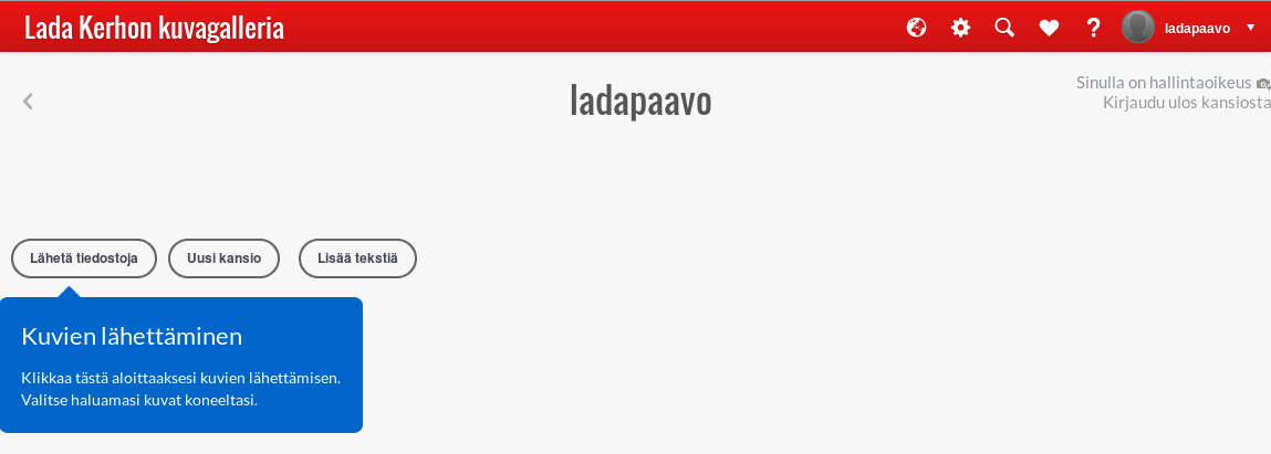 3. Kun olet saanut tähän kuittauksen, siirry seuraavaksi siirry selaimella http://ladakerho.kuvat.fi/kuvat/upload/kayttajat osoitteeseen. Nyt sinulla pitäisi olla oikeus nähdä ja päästä omaan kansioosi johon voit siirtää kuvia.