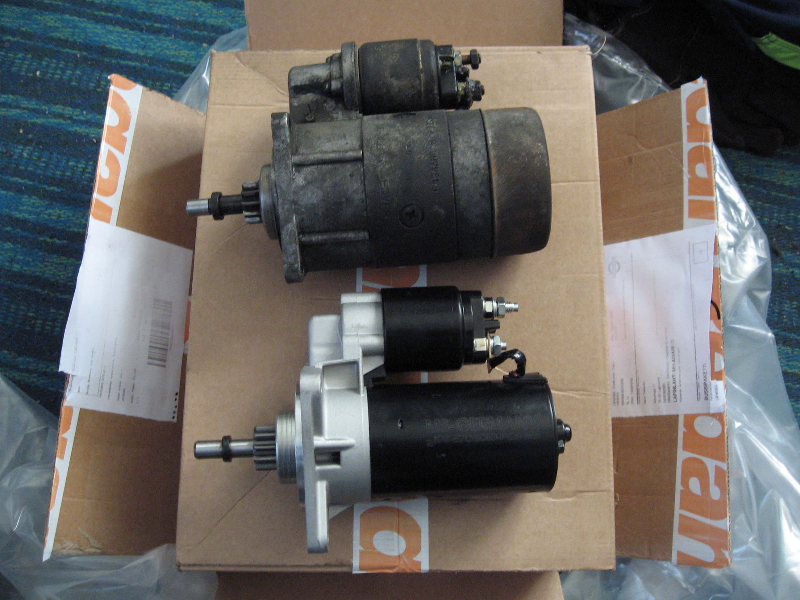 Tilasin Manselta läjän uusia osia, mm. uuden saksassa tehdyn tarvikemallin startin. Kurkkasin startin sisään, ja se näyttää olevan alennusvaihteellinen nelihiilinen kestomagnetoidulla staattorilla oleva startti, ja pieni kuin mikä. Pienikokoisuutensa ja kestomagnetoidun staattorinsa vuoksi tuo starttimoottori ei kyllä hirveästi herätä luottamusta, ja mielummin olisinkin kunnostanut vanhan startin laittamalla siihen uuden solenoidin, hiilet ja bendixin, mutta kunnon korjaussarjaa ei Suomesta saanut mistään. Täytyy pitää orkkisstartti tallessa ja kunnostaa se sitten joskus, kun saa osat hankittua.