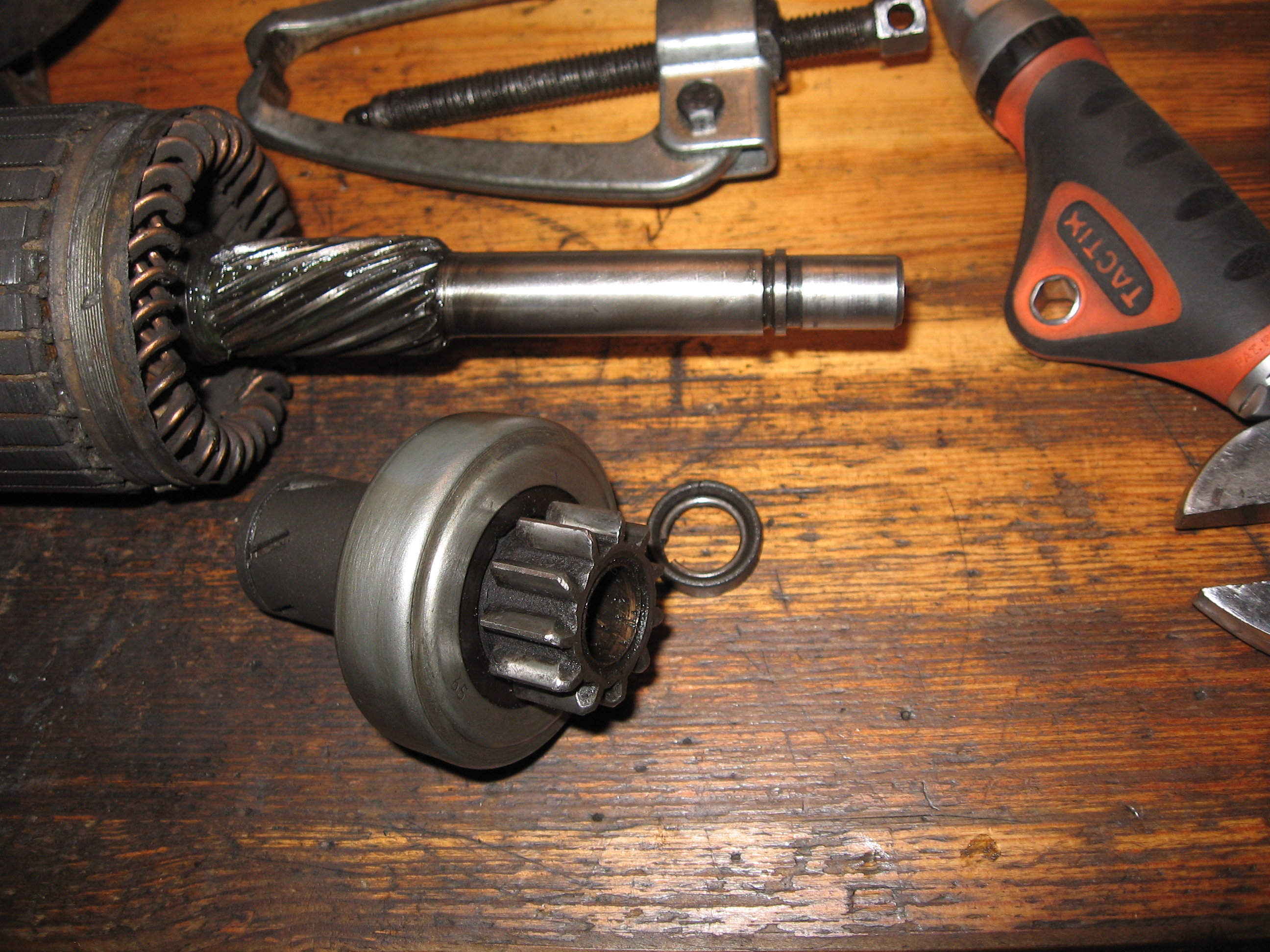 Purin vanhan startin osiin. Huomio Samaran orkkisstarttia kunnostaville: Starttimoottorin akselin päässä on bendixiä paikoillaan pitämässä pieni painelaakerilta näyttävä holkki, joka näyttää intuitiivisesti irtoavan ulosvetäjällä. Kyseessä ei kuitenkaan ole painelaakeri, vaan lukitussokkaa paikoillaan pitävä holkki, joka pitäisi ilmeisesti lyödä sisäänpäin esim. sopivan kokoisella hylsyllä ja sen jälkeen irrottaa itse sokka. Holkki halkeaa, jos sen vetää väkisin pois ulosvetäjällä. Tilalle tosin sopinee samankokoisen painelaakerin ulkokooli ja haljenneen holkin voinee hitsatakin takaisin kuntoon.