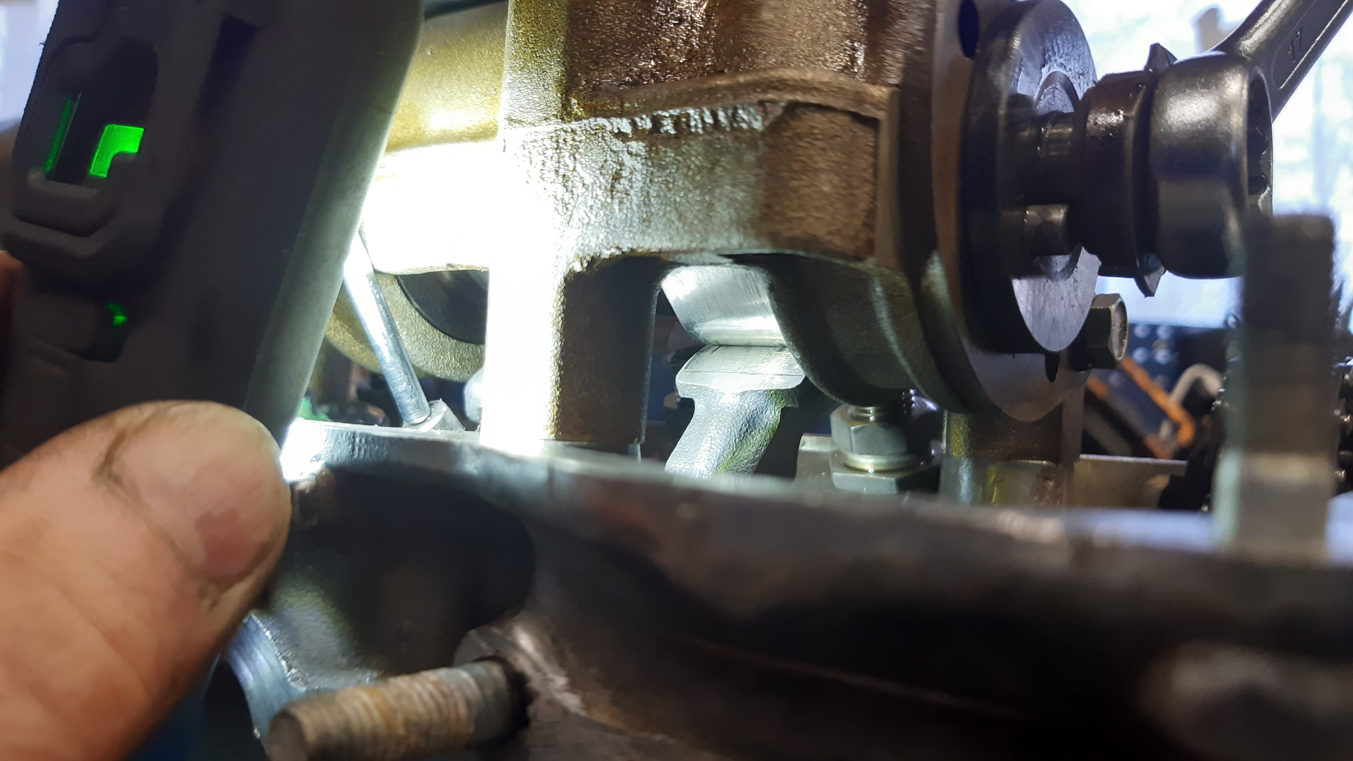 Simpukan tukirauta on liian lyhyt, tuo ylempi pultti jää puoliks raudan ulkopuolelle. Ei onnistu reikiä viilamalla, vaan pitää jatkaa...