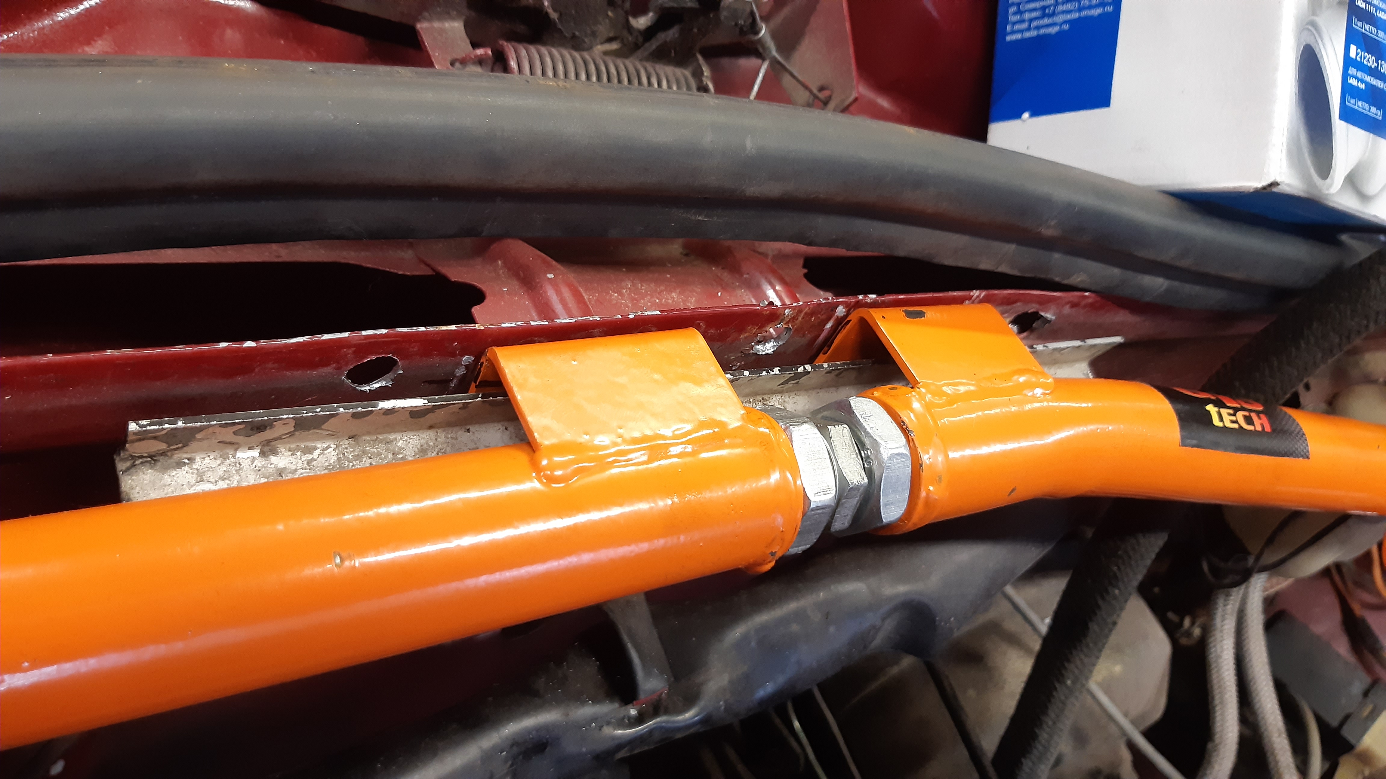 No jotaki saatu aikaseksikin, tuo moottoritilan tuki kävi aika hyvin paikalleen. Hitsasin noihin kotelon sisään tuleviin käikäleisiin korilaatat, nyt tukee hyvin palkin takaosaanki. Konepellin tiivisteen kohalta pulttaan kaaren koriin kiinni parilla kapeella lattaraudalla.
