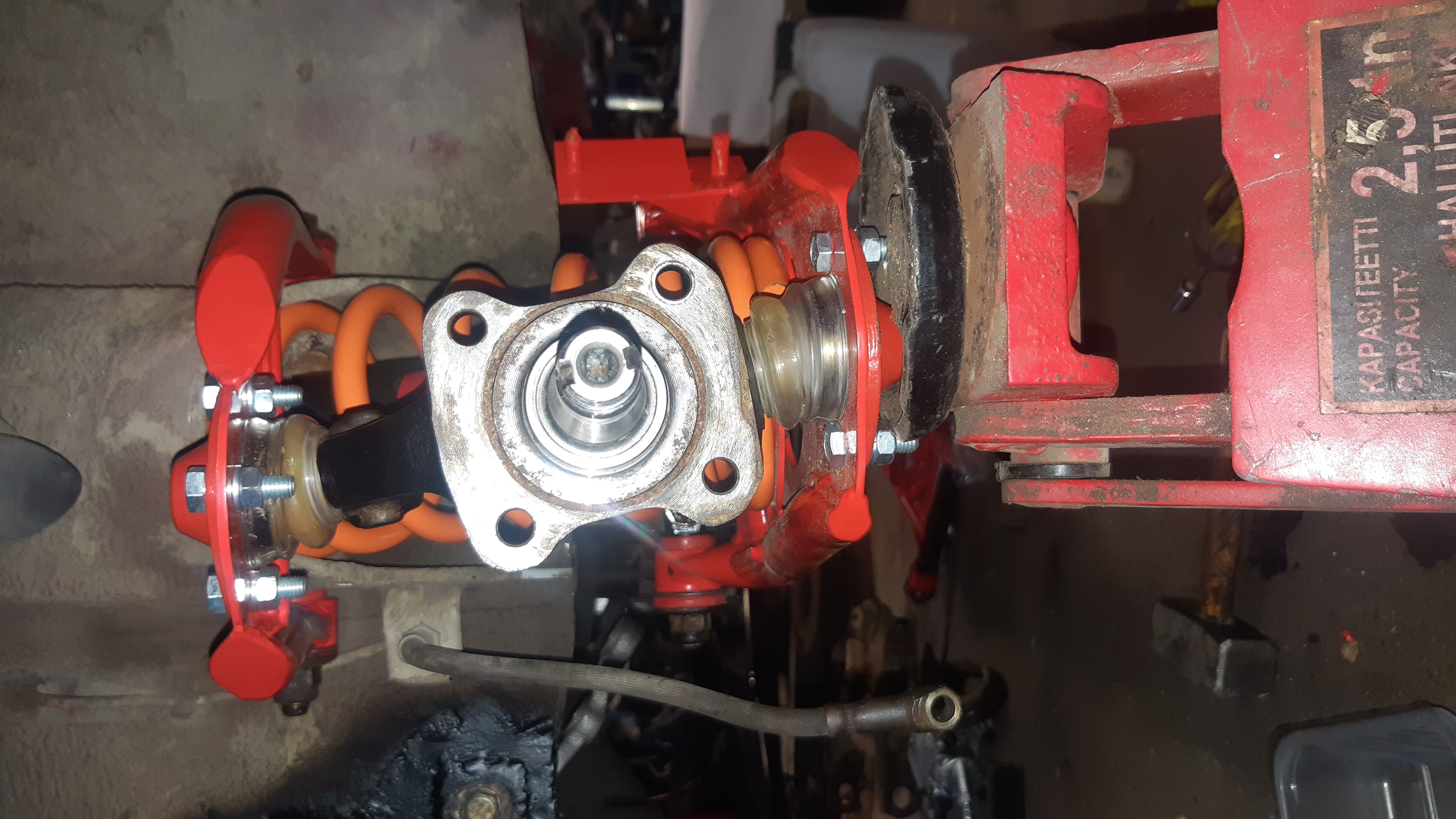 Helat puristelin tukivarsiin ja pulttasin paikalleen. Jousia ja iskareita laittaessa piti laittaa pönkä korista hallin kattoon, ettei auto nouse ilmaan. Pienen ähräyksen jälkeen sain iskarin mutterin kiinni poikkituen silmukan päälle.