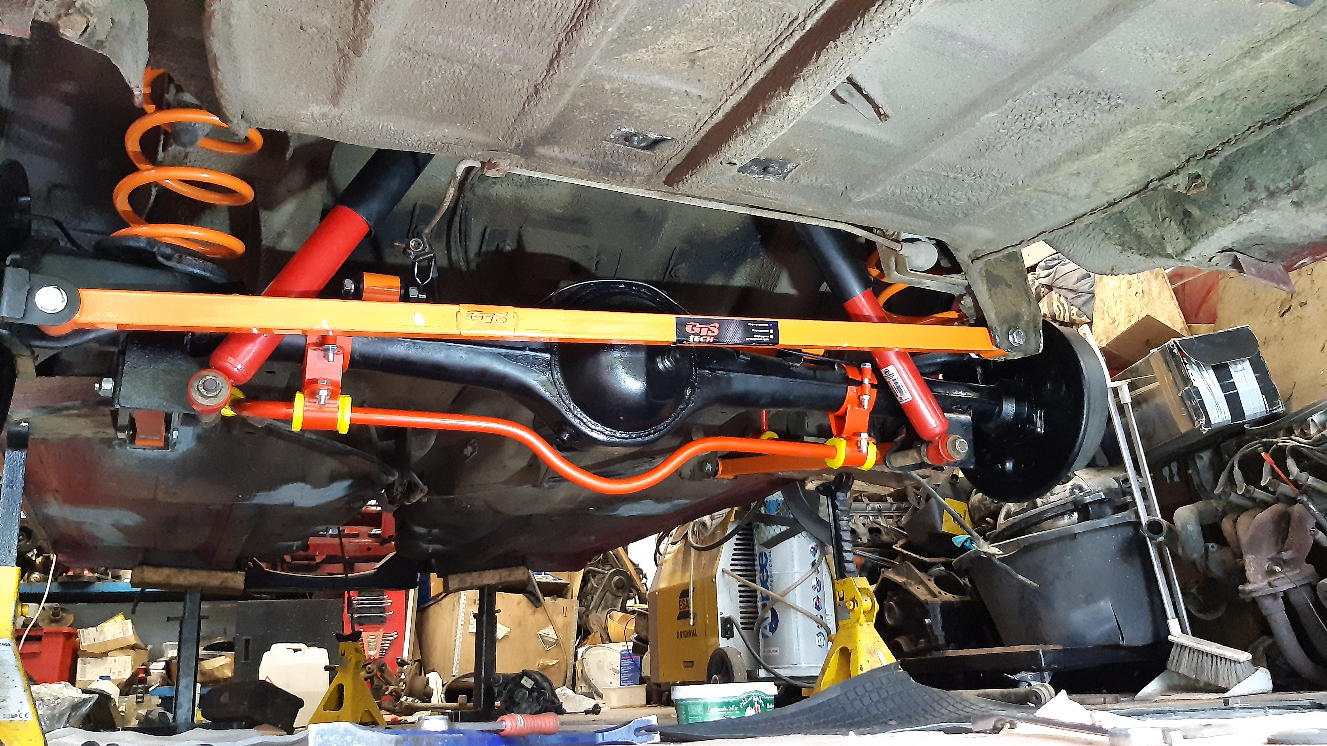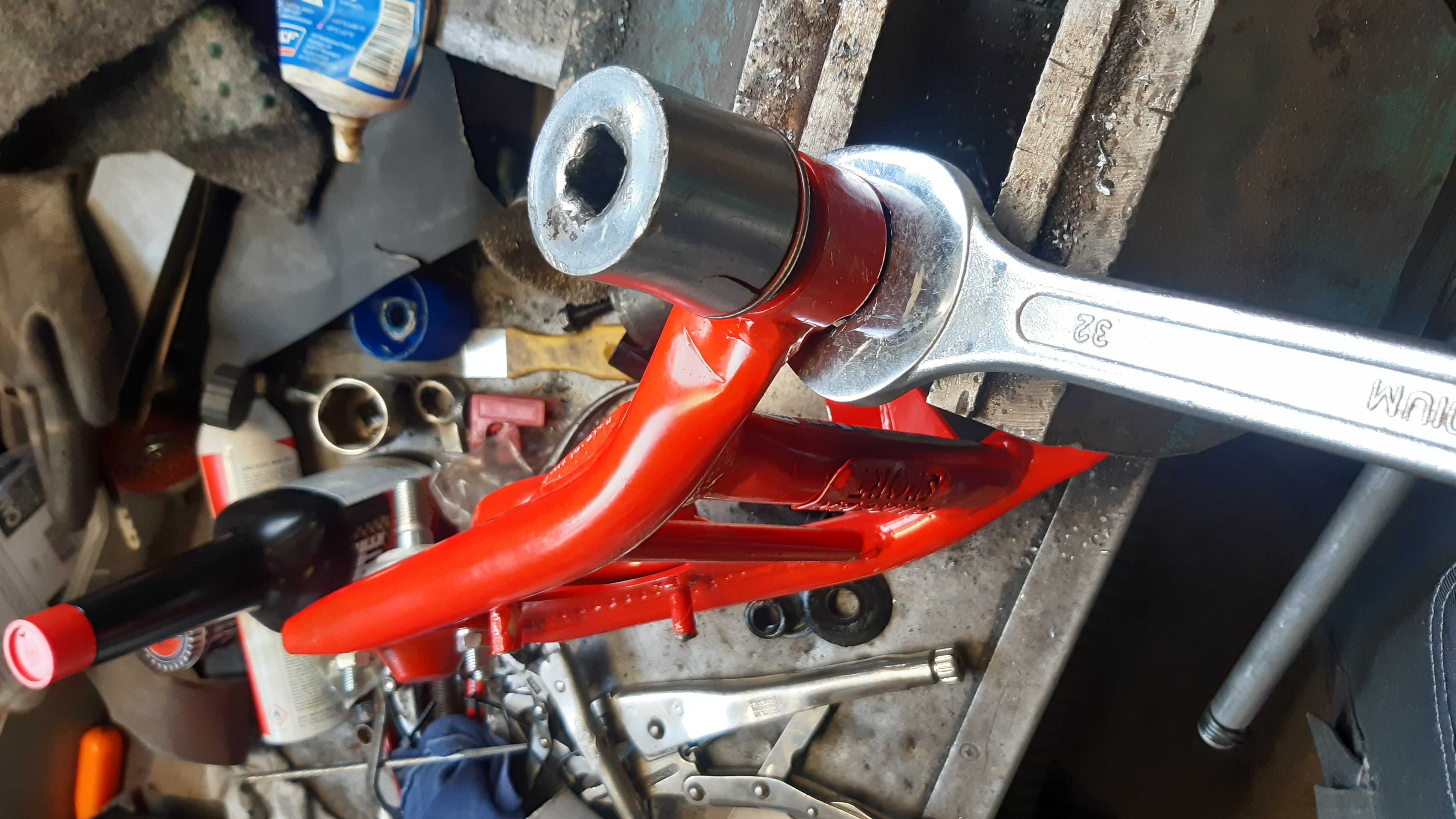 Helat puristelin tukivarsiin ja pulttasin paikalleen. Jousia ja iskareita laittaessa piti laittaa pönkä korista hallin kattoon, ettei auto nouse ilmaan. Pienen ähräyksen jälkeen sain iskarin mutterin kiinni poikkituen silmukan päälle.