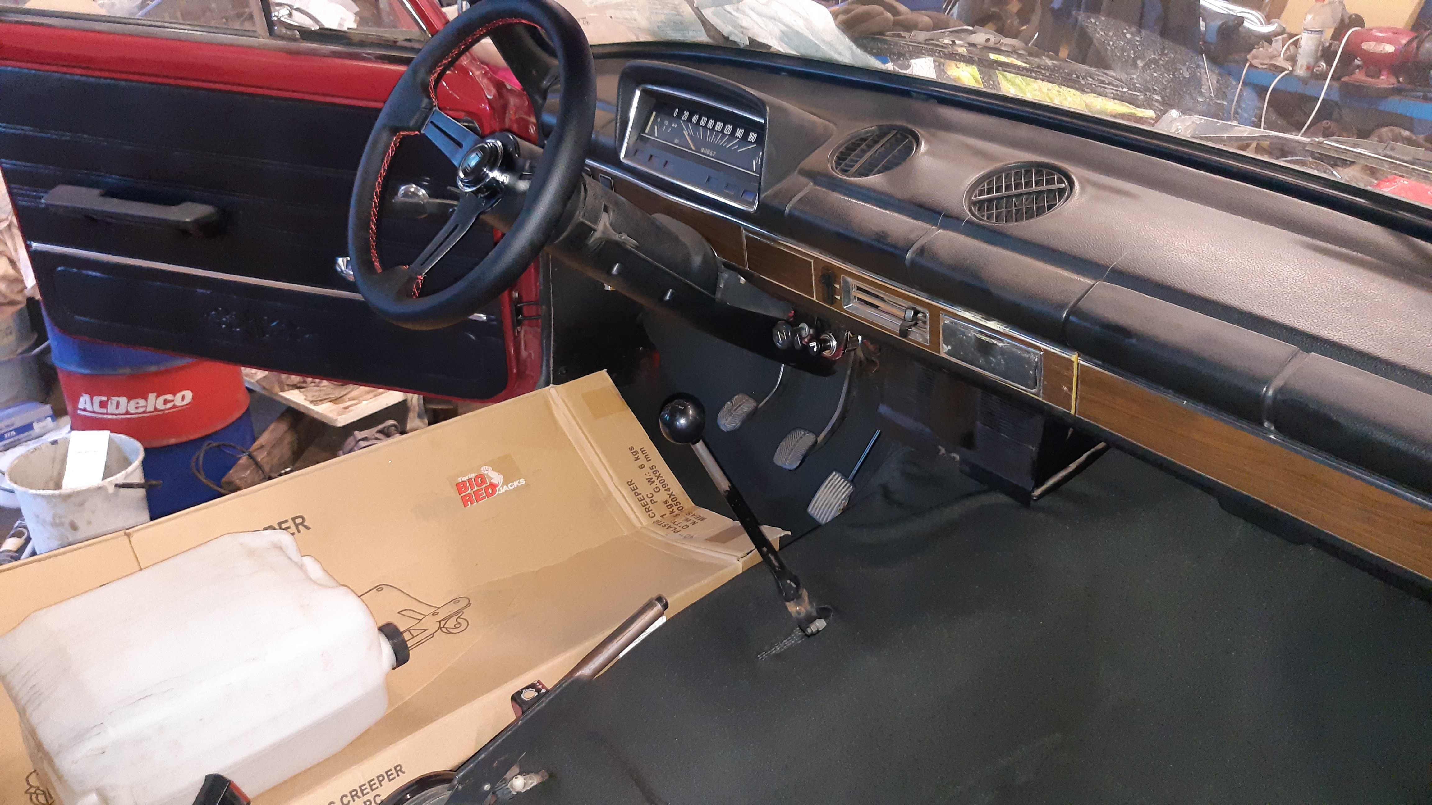 Omistaja kävi kasailemassa sisustaa, alkaa olla etupenkkejä vaille valmis. Laitteli samalla kardaania, pakoputkee, starttia ja laturia ym. paikalleen.