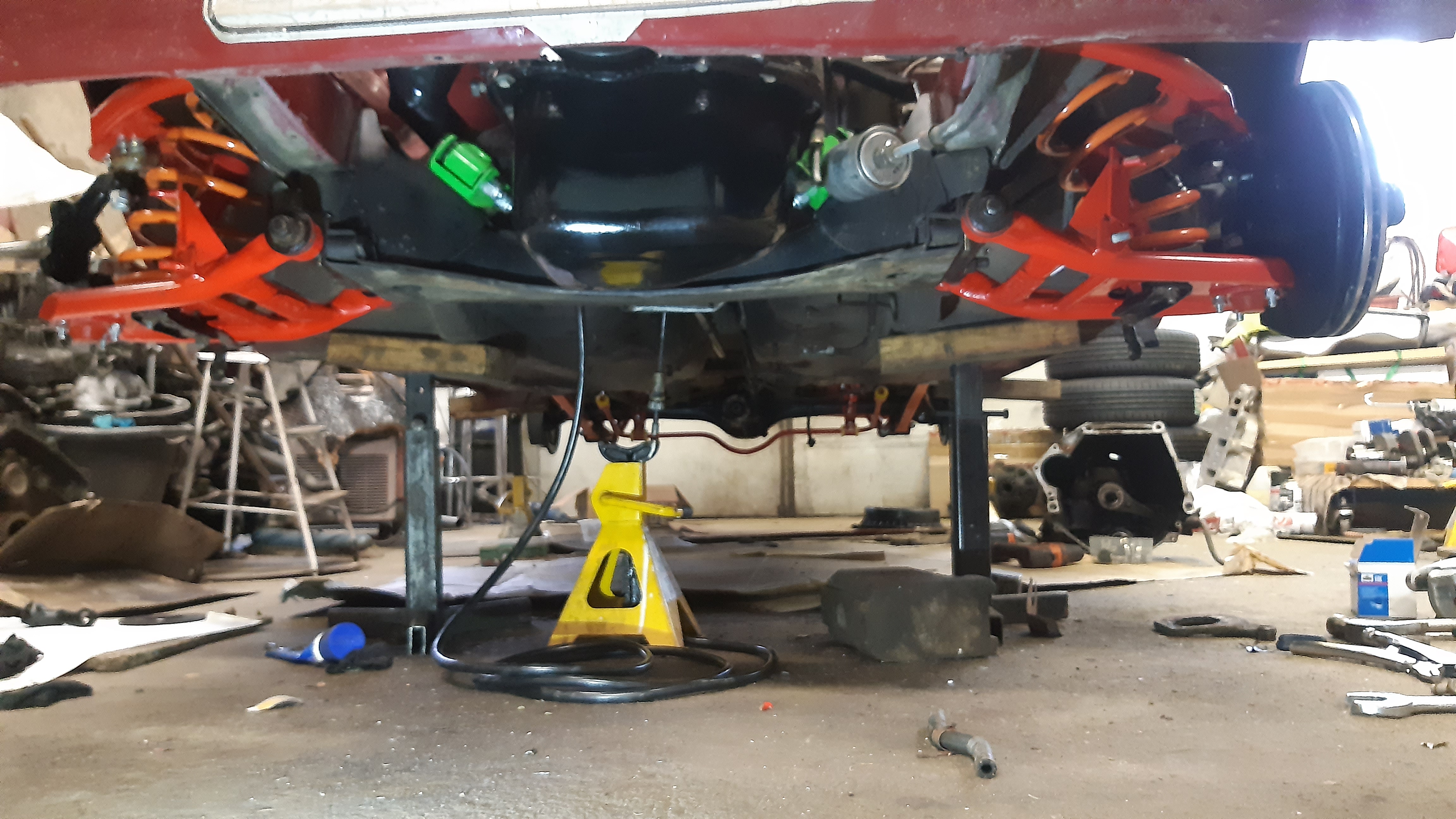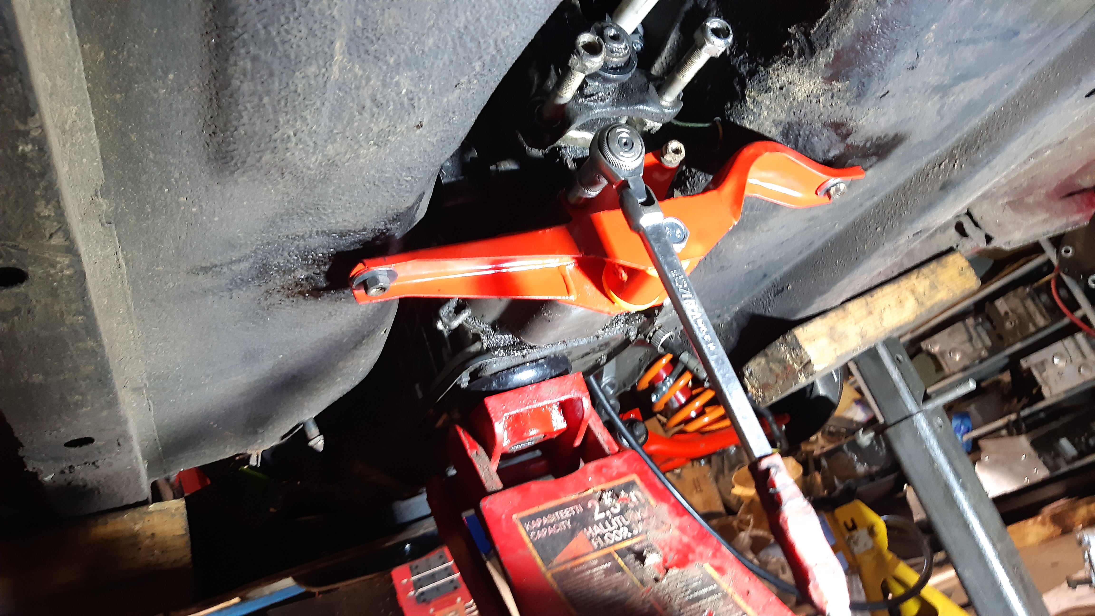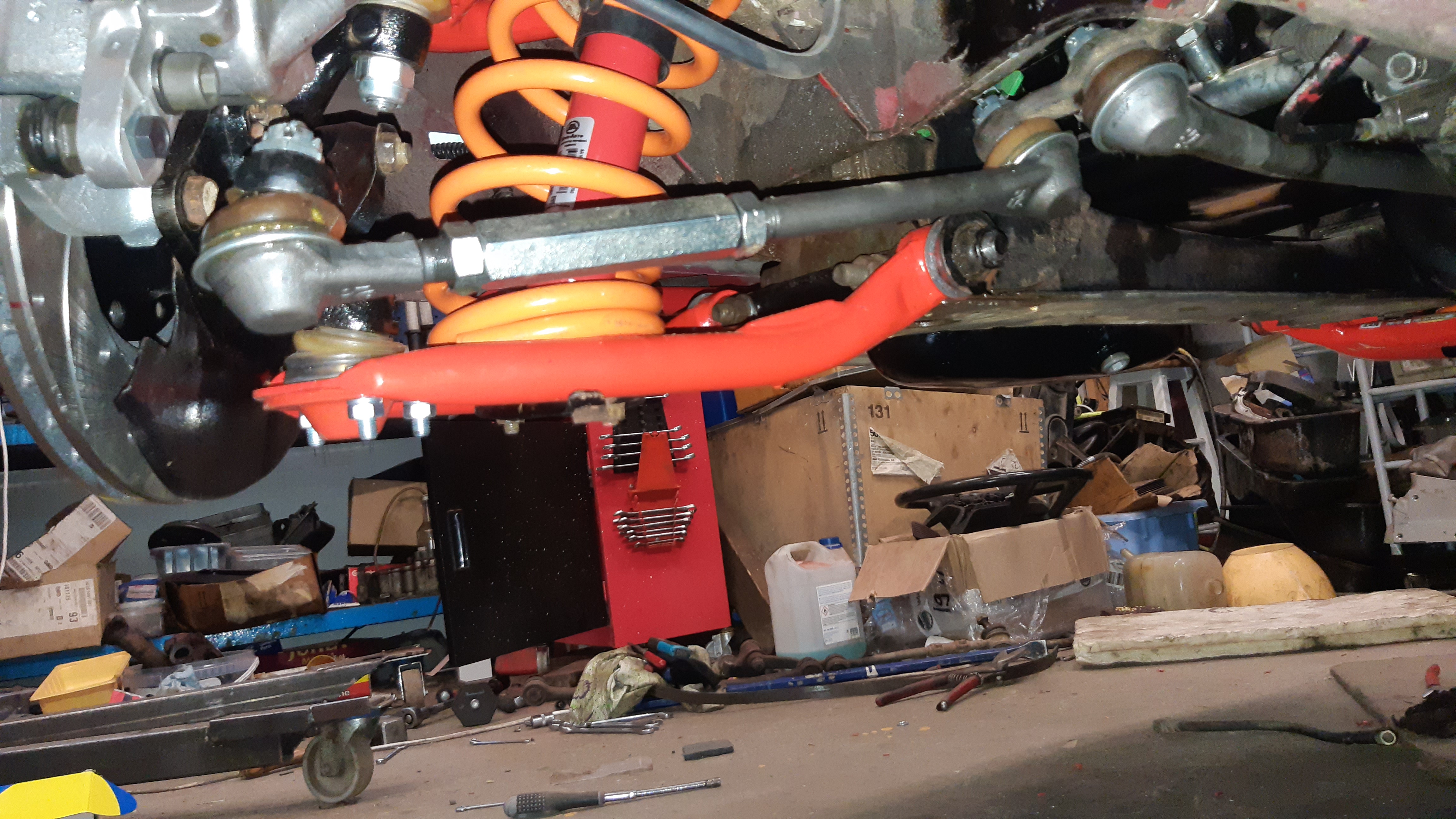 Sarjan mukana tullu kytkinsylinteri asennettu ja ilmattu. Jarruletkut asennettu, putkien/letkujen kiinnityksiä joutu hieman muokkaamaan. Lootaan ja perään laitettu uudet liemet. Raidetangot asennettu, tähän tuli ne pitemmät välikappaleet. Pakoputki ja laajakaista seosmittari asennettu ja kytketty.