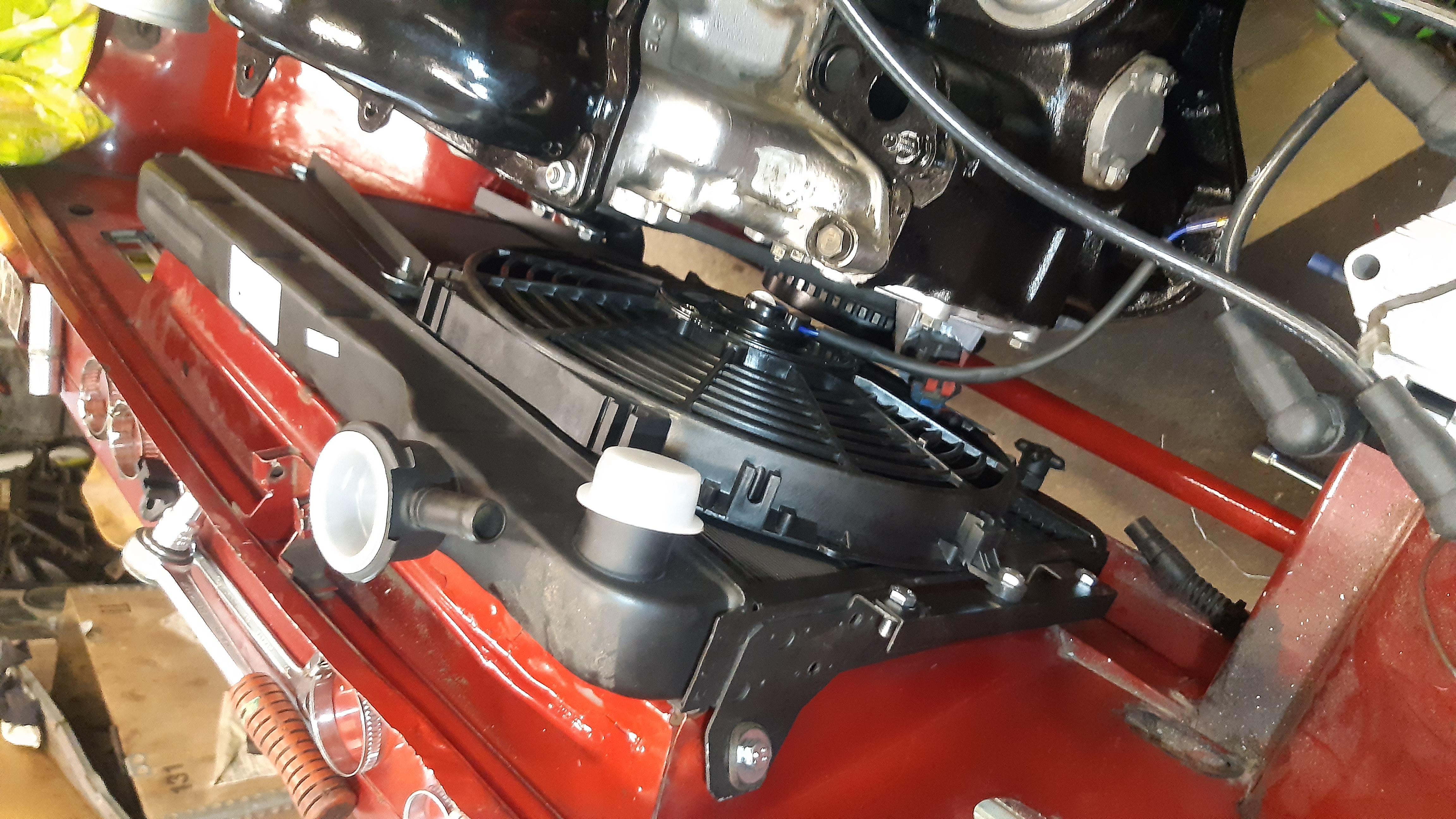 Termostaatti, letkuja ja piuhoja asennettu. Montaa kohtaa on joutunu enemmän tai vähemmän muokkaamaan/säätelemään hi-performassin alttarilla😂