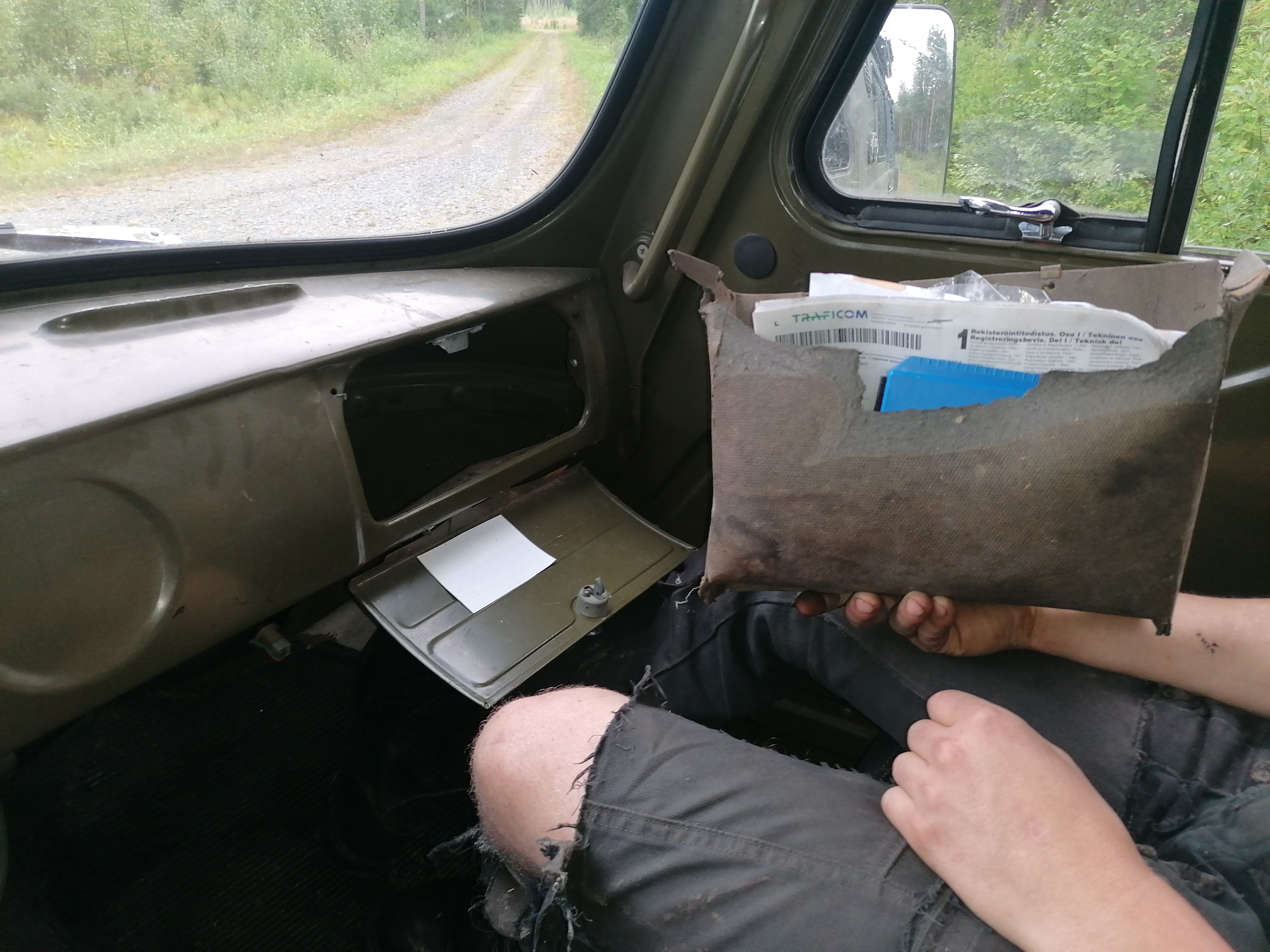 SItten käytiin jossain metsäautotien tapaisilla teillä ajelemassa ja yhdessä kohdassa kaksi tietä ristesivät ja koska maasto oli siinä tasaista ja aukeaa niin oioin hieman sisäkurvin puolelta. Maastoutui vaan oja niin hyvin siihen heinikkoon ettei tullut ollenkaan huomattua, vauhtia joku 40-50kmh ja Uazhan oikein kivasti hyppäsi yli, mahtoi siinä vieressä mopoilijat ihmetellä. Uaz meni vauhtiin nähden yllättävän pehmeästi yli mutta me Ladaritarin kanssa hieman pompattiin ohjaamossa ja tavarat tietty kontissa myöskin. No muuta ei kuitenkaan käynyt kuin, että hanskalokeron pahvinen pohja petti ja rysähti lattialle.