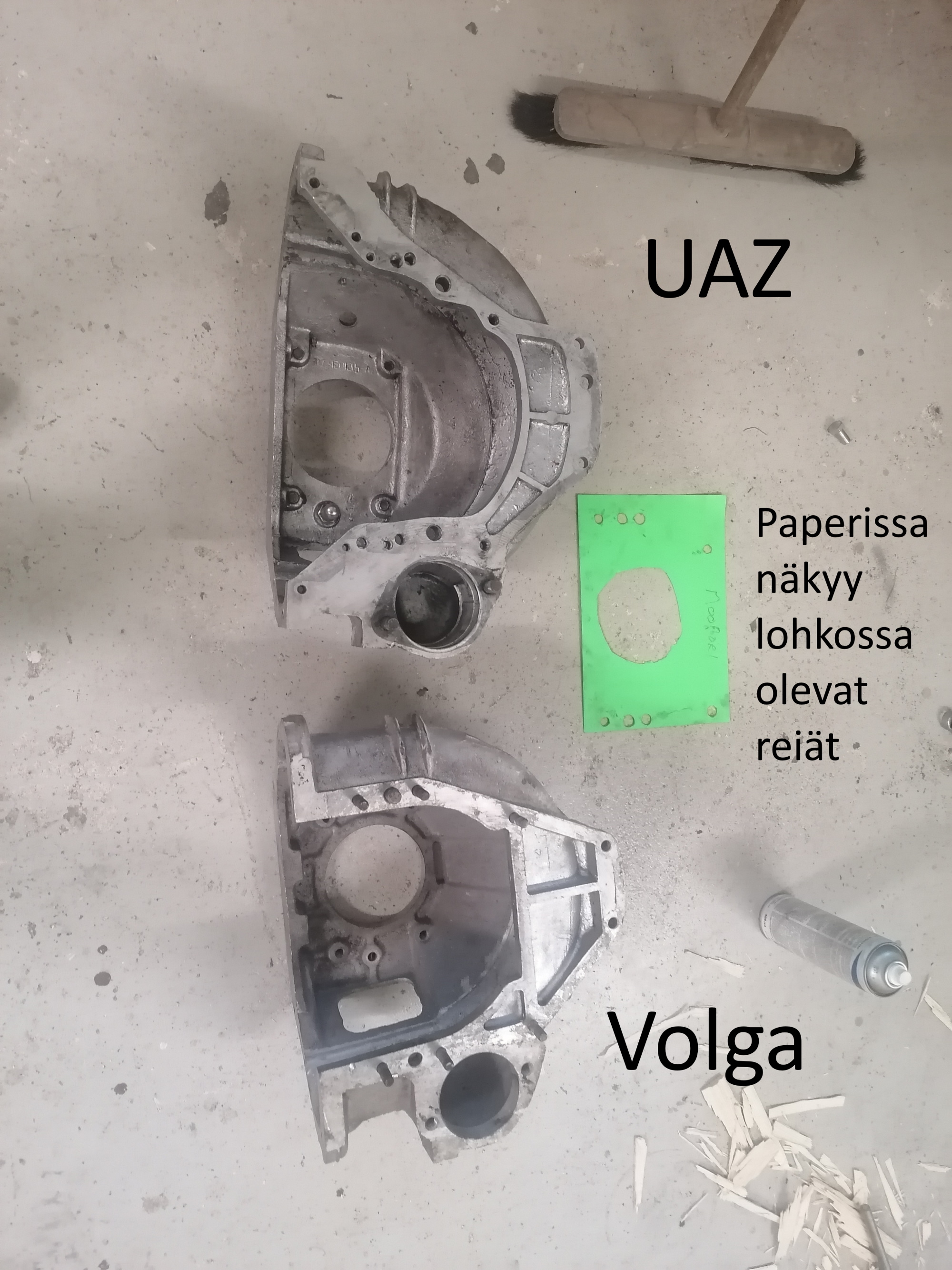 Volgan ja Uazin kytkinkoppia netistä vertailin, niin eihän niissä ollut kuin muutama pultinreikä samassa kohtaa, tähän omaani on sitten joku aikaisempi omistaja porannut puuttuvat reiät hieman vääriin kohtiin ja sen takia sitten kytkinkoppa ei ole linjassa. Tästä nyt sitten johtuu kaikki kytkimen särkymiset ja startin toimimattomuudet. Taas nähdään, että tuuninki ei kannata, olisi vaan pidetty Uazin moottori tässä eikä lähdetty vaihtamaan Volgan konetta. Sitten meinasi jo kiire tulla sillä armeija-autojen kokoontumisajot lähestyivät ja sinne oli tarkoitus Jyväskylästä lähteä kolmella Uazilla.