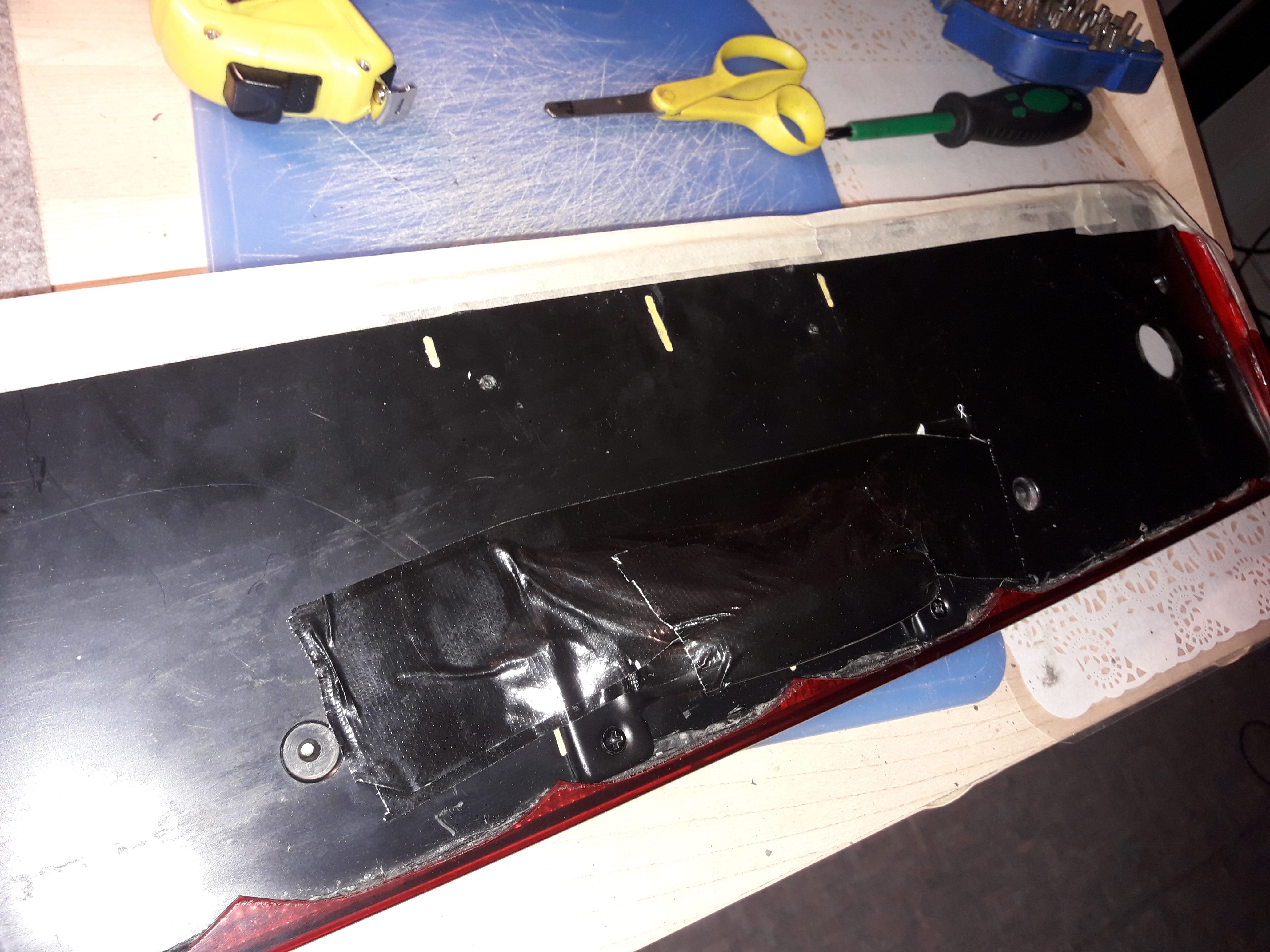 Innoissani tulin ajattelemattomuuttani rikkoneeksi sen heijastimen reunankin, vaikka se olisi ilman muuta ollut kiva tuossa. Tein sitten uuden muodon reunukselle maalarinteipillä, jonka kovetin polyesterihartsilla sekä lasikuitumatolla. Kaipaa toki hiontaa sekin! :lol: