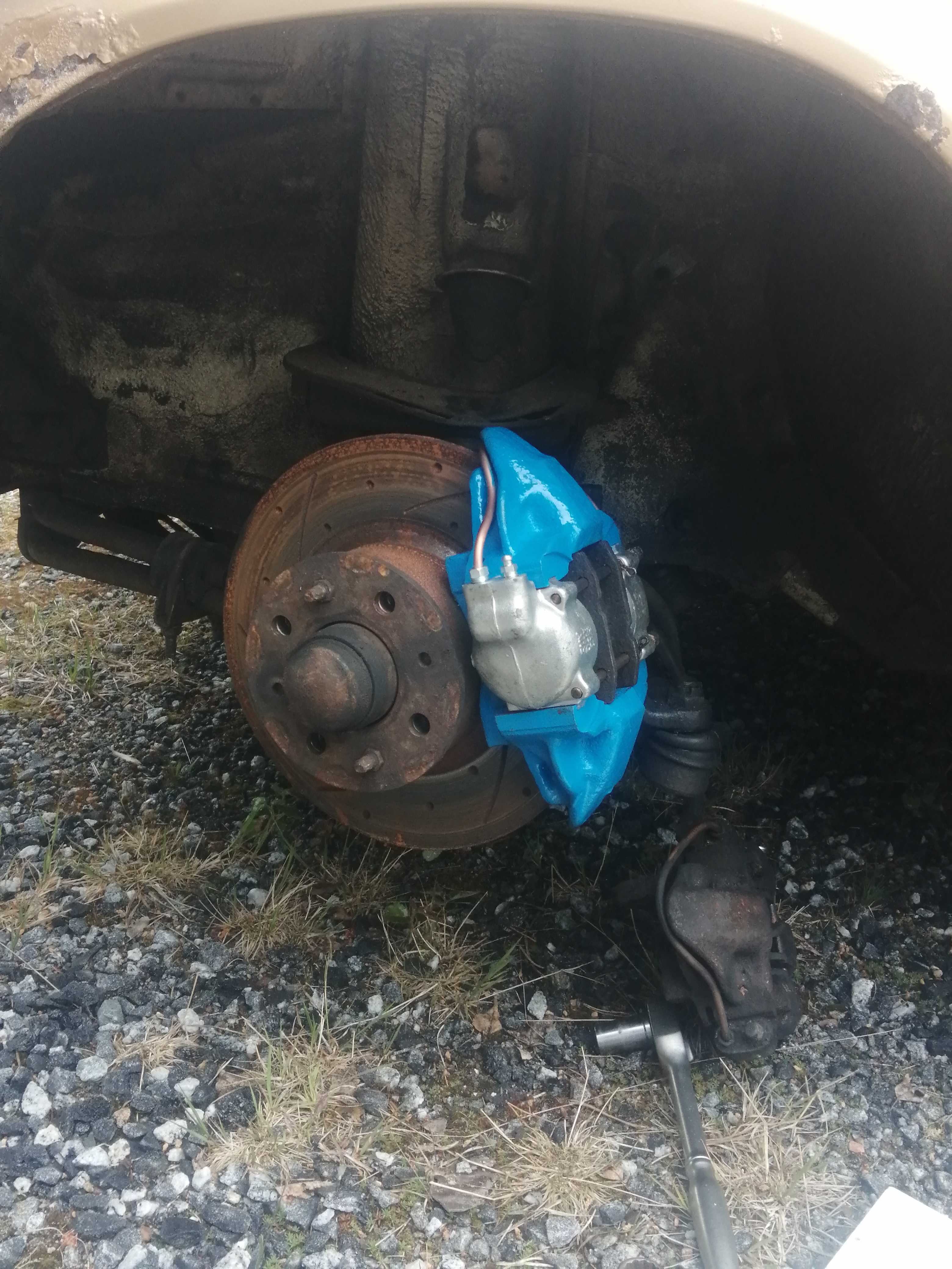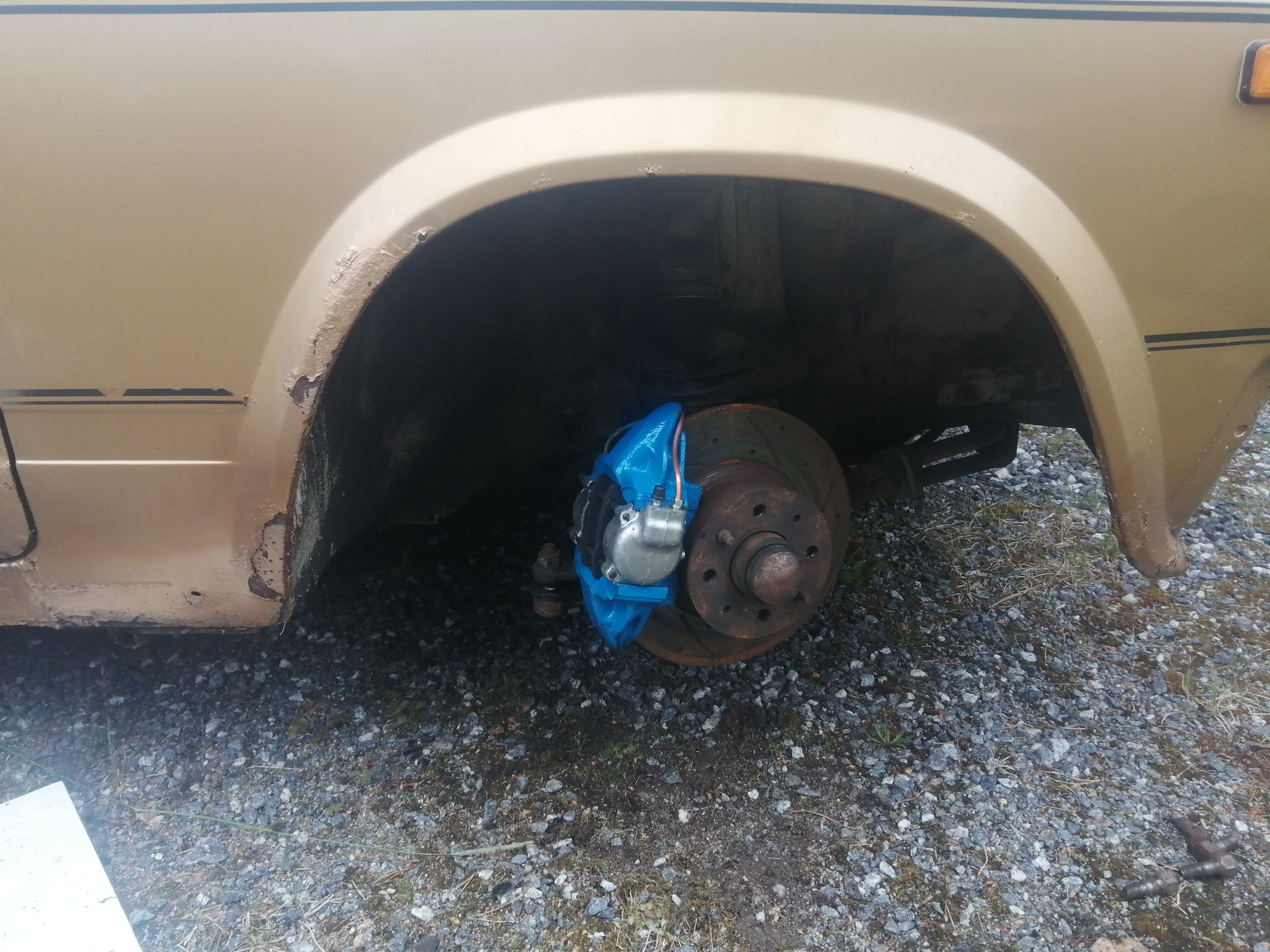 Tänään vaihtui eteen uudet racing jarrupalat sekä jarrunesteet. Tein myös pienet ilmanohjaimet jarrukilpeen sisäpuolelle, että ilmavirta voisi levyjä viilentää. Voi toki olla ettei ilmaa tuonne paljoa virtaa. Moottorin tukikumi vaihtui myös uuteen niva mallin kumiin, kun vanha orginaali oli antautunut ja päästi moottorin heilumaan. Renkaita katsottu valmiiksi ja enne lähtöä pitäisi vielä jotain ehtiä tekemään.