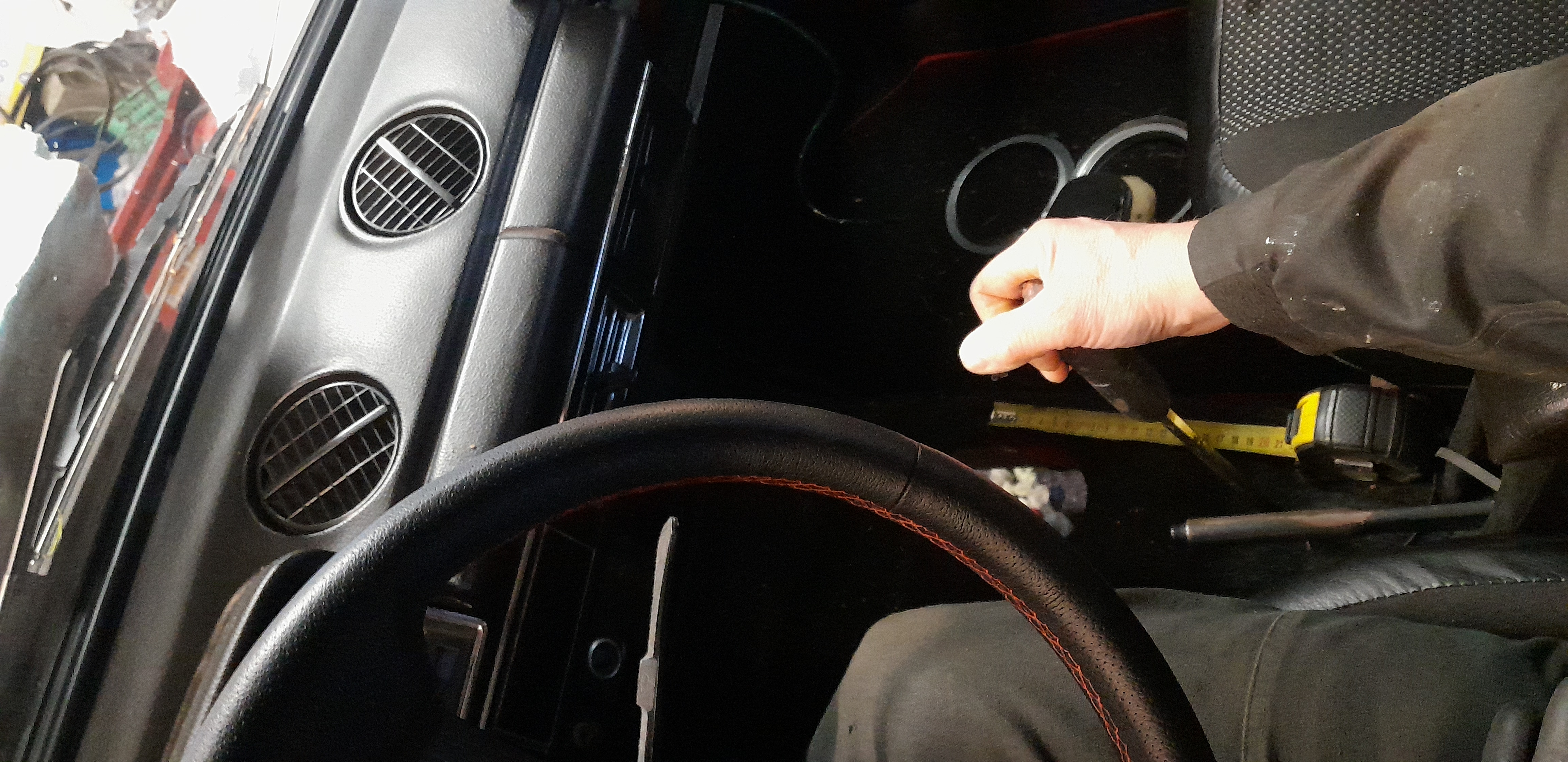 Kone tulee 3cm apukuskin puolelle päin ja rupesin mittailemaan linjauksia. Näyttäs että kardaanitunneli ja kone/loota alunperinki on sen 2cm apukuskin puolella, eli ei sen puoleen mitään hätää. Porasin reikäsahalla vaihdekepin reiän pikkasen enemmän apukuskin puolelle, että saa tekniikkapaketin mahollisimman suoraan. Reikä tuli sentin liian taakse, kun oli aika hankala hahmottaa paikkaa, vaan eipä tuo haittaa....