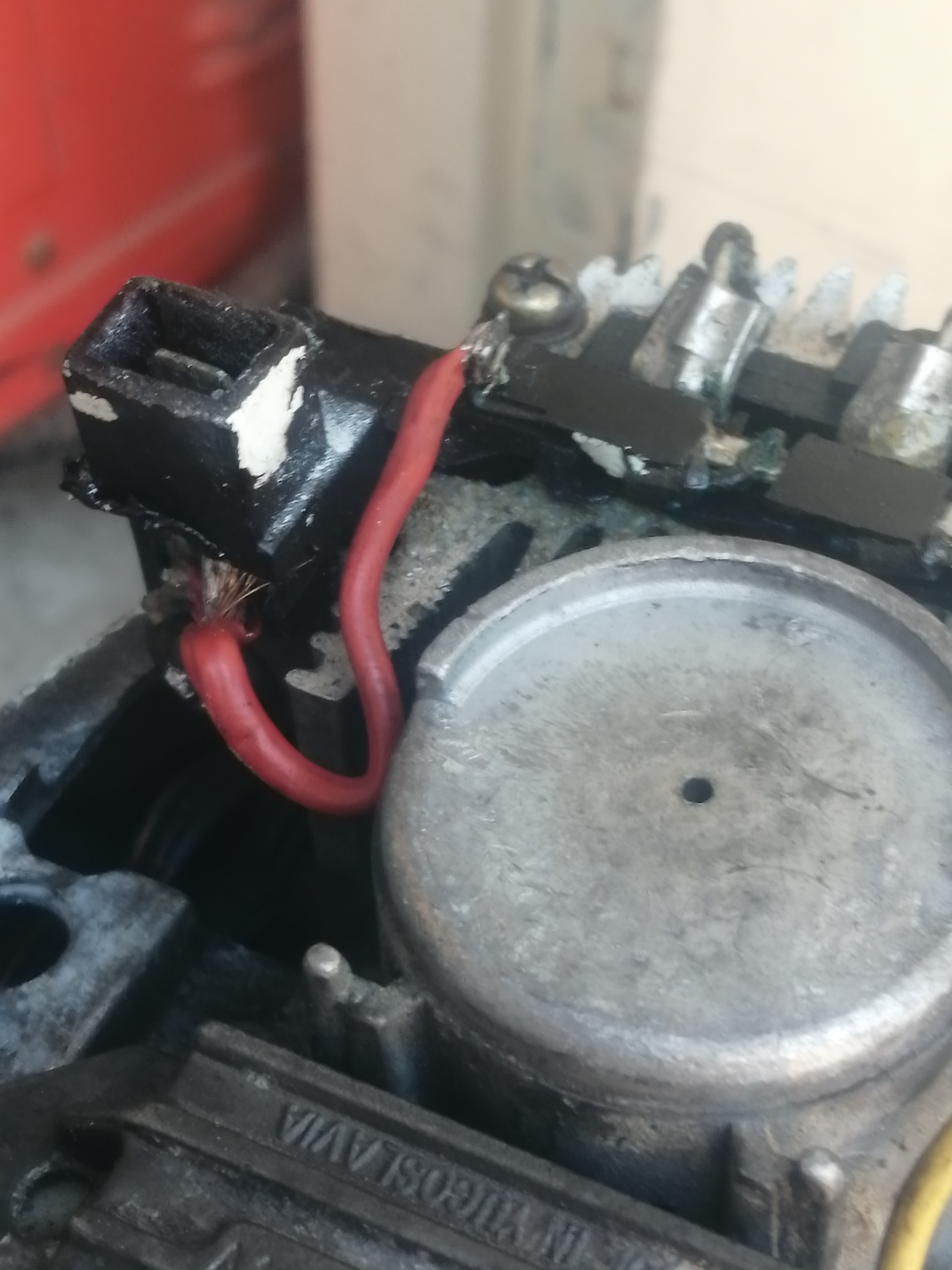 Laturia päästy sipistelemään. Hiili vaihdettu ja hiilen jousta (joka oli sulanut pitimeen) venytetty. Näiden toimenpiteiden jälkeen testattu ettei lataa. Lisää mittauksia ja todettiin herätevirtaliittimen johto hapettuneen myös poikki, siis laturin sisällä oleva. Johto näytti olevan hyvin paikallaan mutta kun sitä väänsi niin irtosi ja kuoriessa paljastui puolisenttiä vain vihreää tuhkaa...