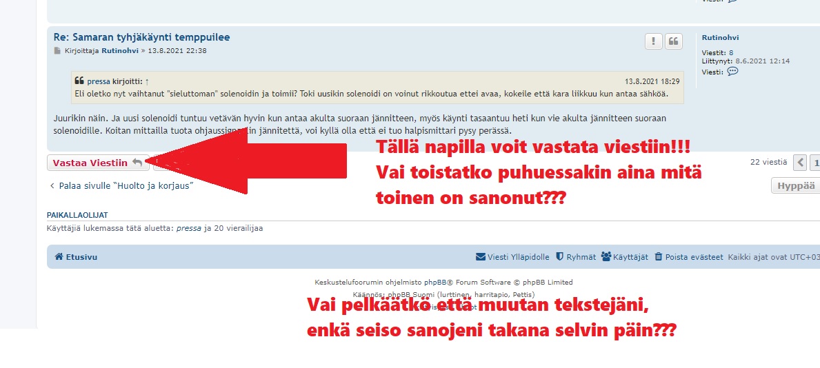 pressa kirjoitti: 13.8.2021 18:29 Eli oletko nyt vaihtanut "sieluttoman" solenoidin ja toimii? Toki uusikin solenoidi on voinut rikkoutua ettei avaa, kokeile että kara liikkuu kun antaa sähköä.