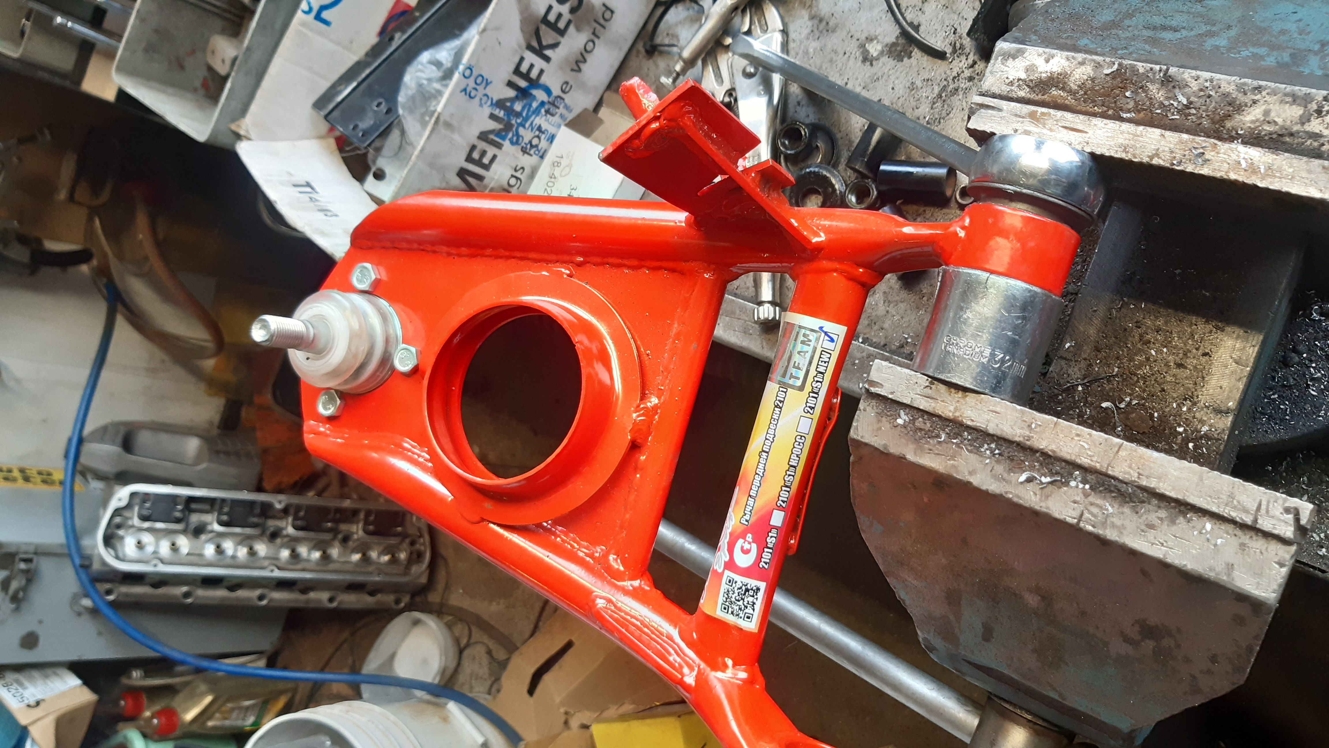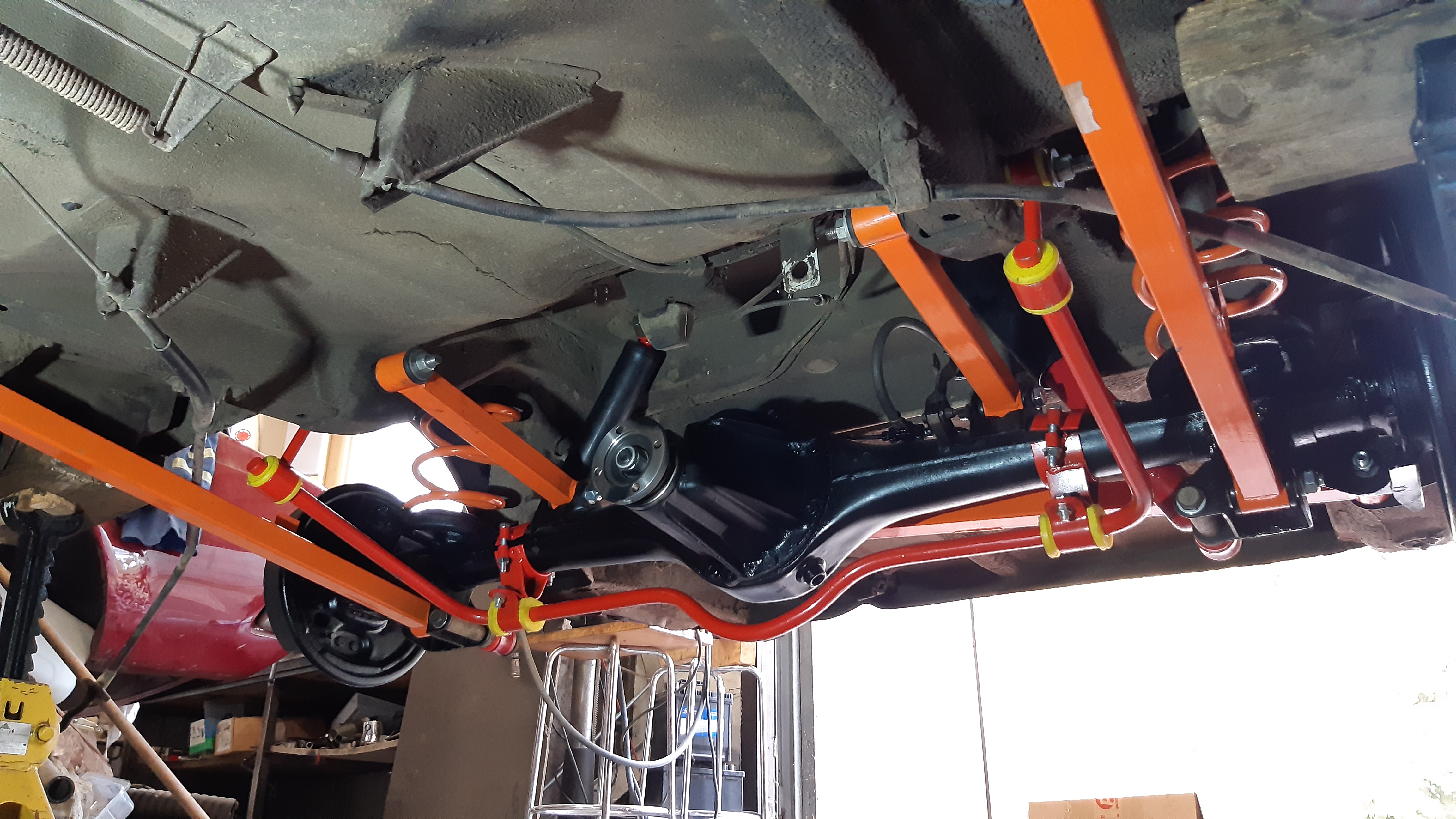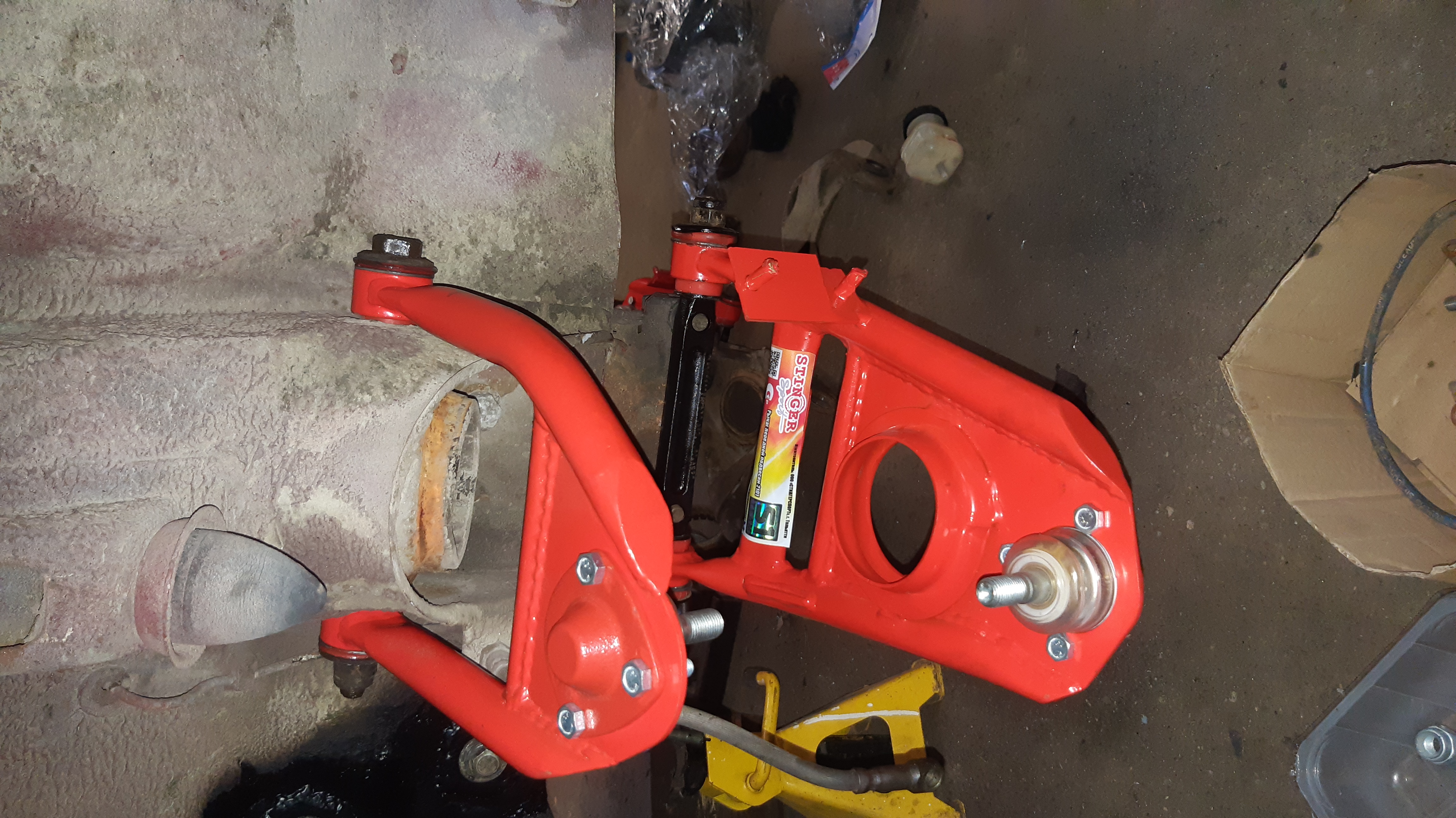 Helat puristelin tukivarsiin ja pulttasin paikalleen. Jousia ja iskareita laittaessa piti laittaa pönkä korista hallin kattoon, ettei auto nouse ilmaan. Pienen ähräyksen jälkeen sain iskarin mutterin kiinni poikkituen silmukan päälle.