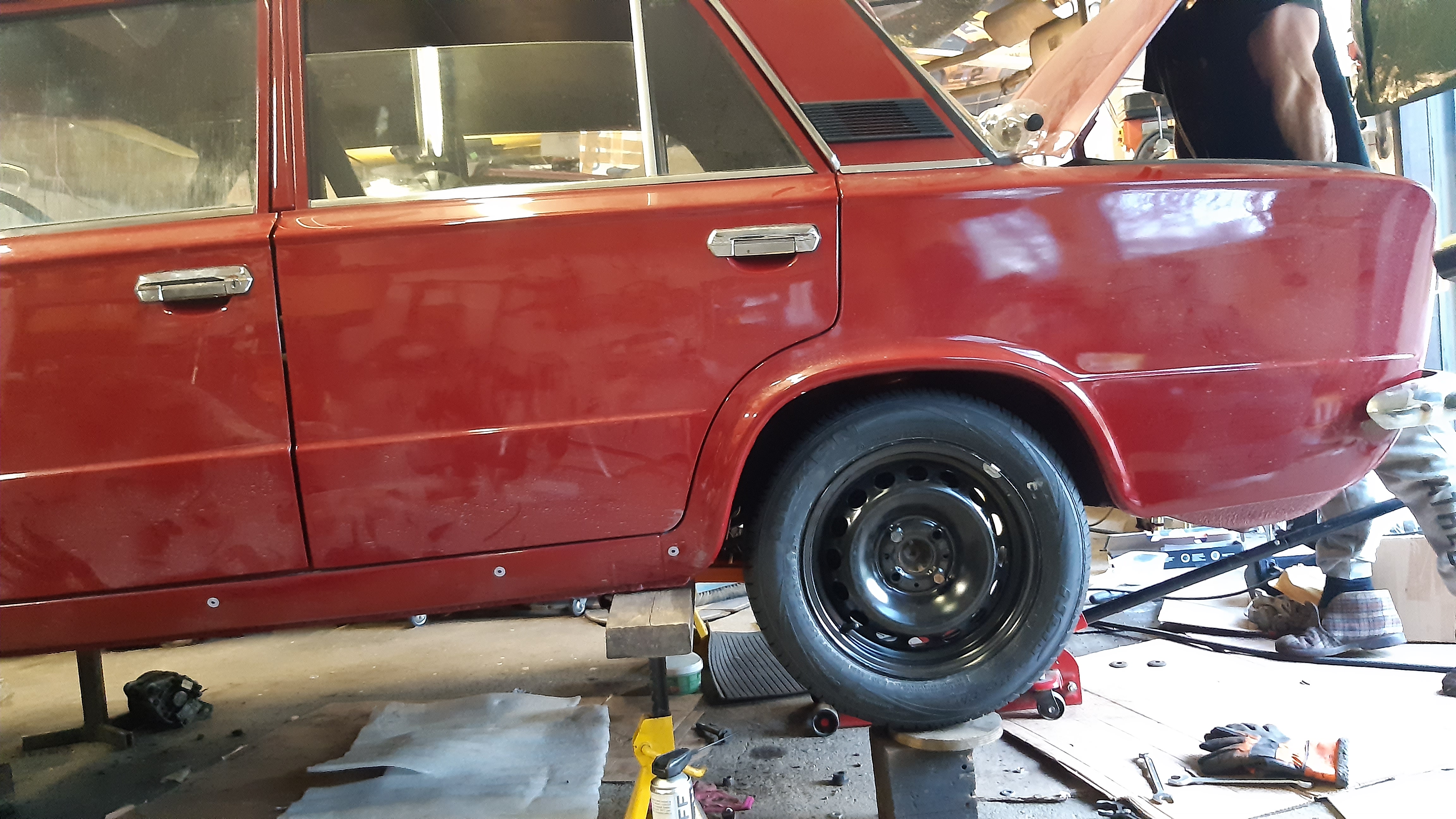Tunkkasin perän ylös pukeilta ja mallattiin vähän uusia pyöriä, 185/60 14". Varmaan tuosta vielä pikkasen jousitus tippuu alemmas...