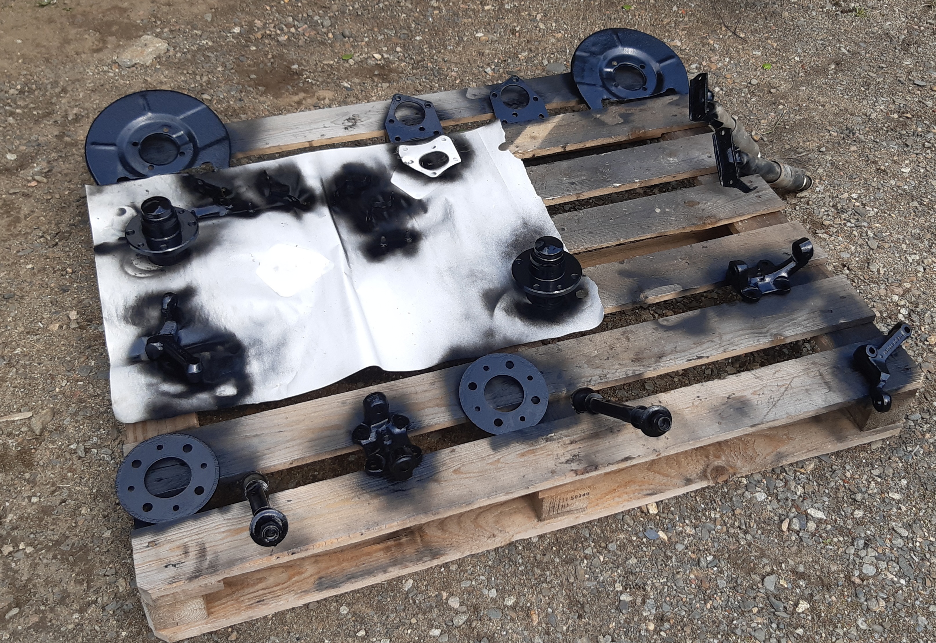 Etupään osia vähän hinkkailtu ja maalailtu. Koekasailin toista pyörännapaa, muuten näyttäs osat käyvän paitsi jarrusatulan kiinnike on pienemmälle levylle. Venäjän puuttuvat ja väärät osat on kuulema jo suomessa, toivottavasti ei tule enää takaiskuja
