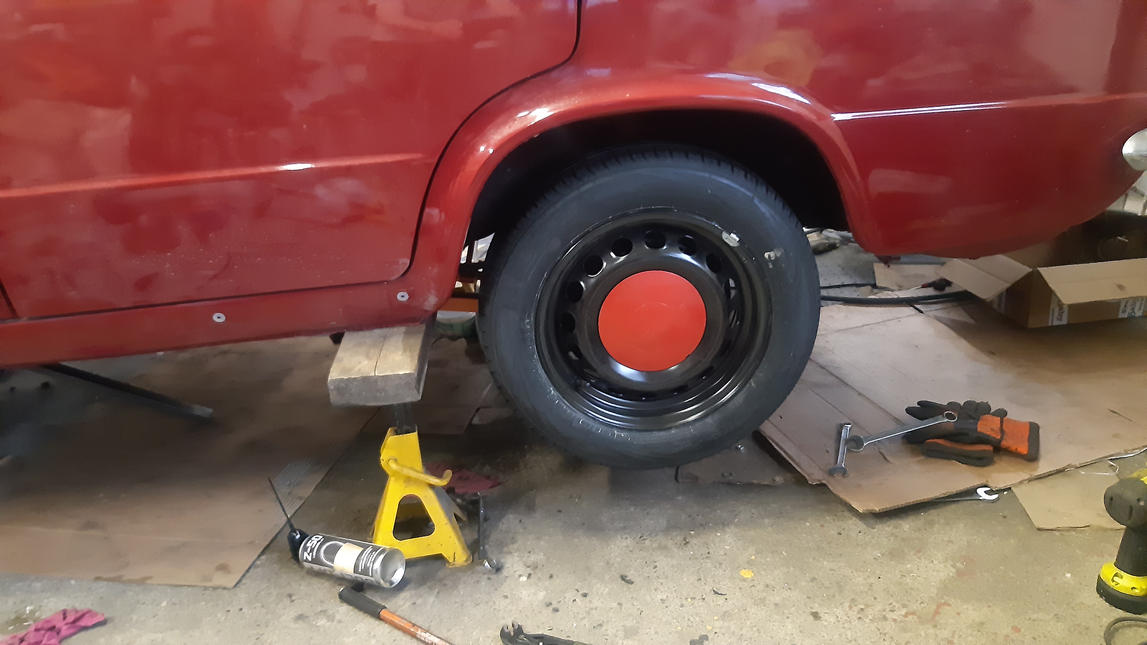Omistaja kävi kasailemassa sisustaa, alkaa olla etupenkkejä vaille valmis. Laitteli samalla kardaania, pakoputkee, starttia ja laturia ym. paikalleen.