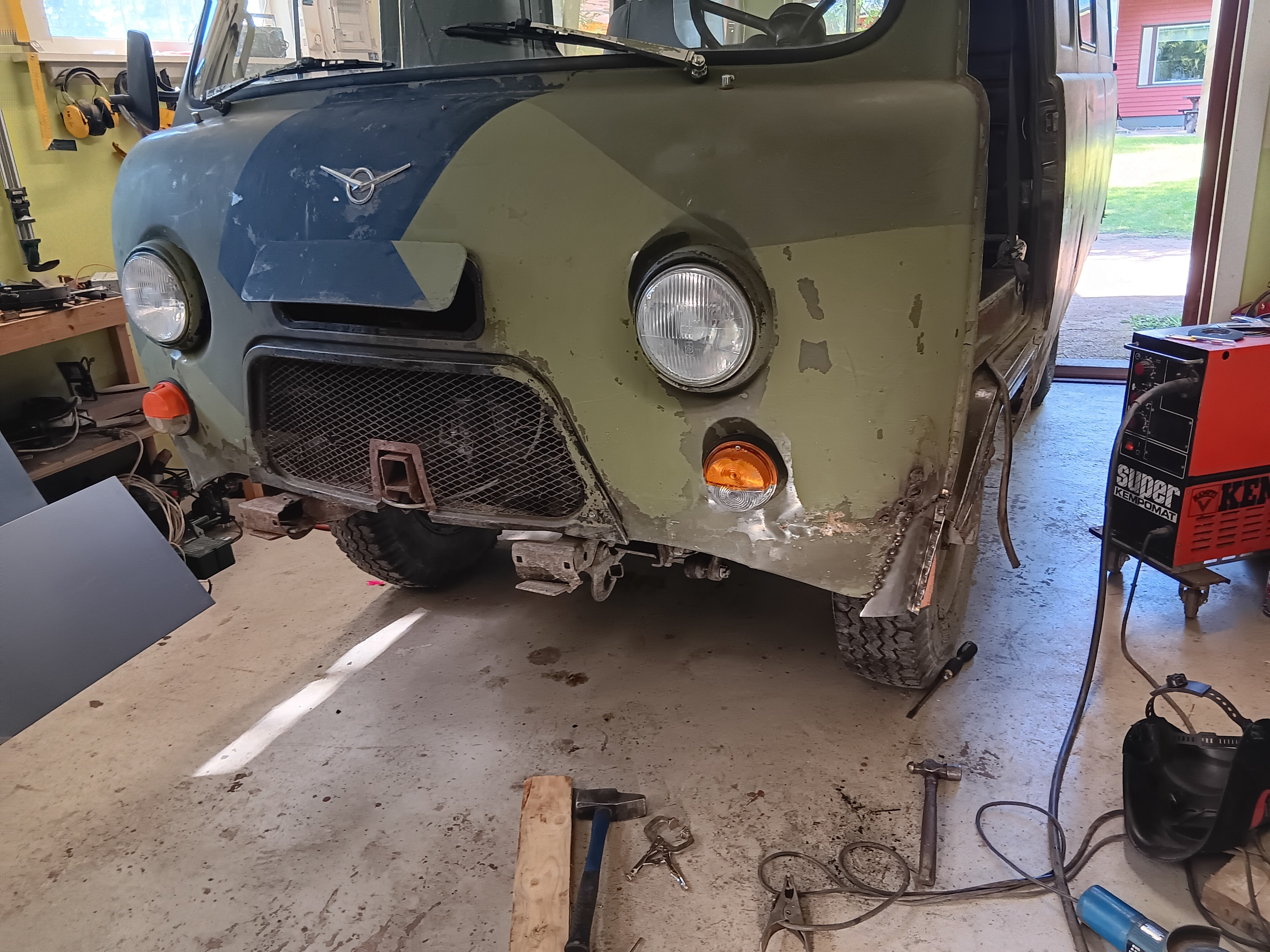 Nyt oli myös aikaa paneutua tuohon etupuskuriin ja sen kiinnitykseen. Helpoin ratkaisu olisi ollut vahvistaa runkoaisan päiden kiinnityksiä niin paljon, ettei enää puskuri putoa. Hommaa hankaloitti se, että halusin puskuriin jotain joustavuutta, muuten vääntyy jostain jotain. Ja sitten halusin myös, että puskuri on niin tukevasti paikallaan, että kestää tunkata. Uazissa kun ei ole kuin akselit mistä tunkata, ja se on mahdotonta jos on akseleita myöten uponnut. Hitsasin ensialkuun pakoputkiklemmarit tonne puskurin alle, että näkee mistä kestää tunkata ja ettei tunkki lipsahda.