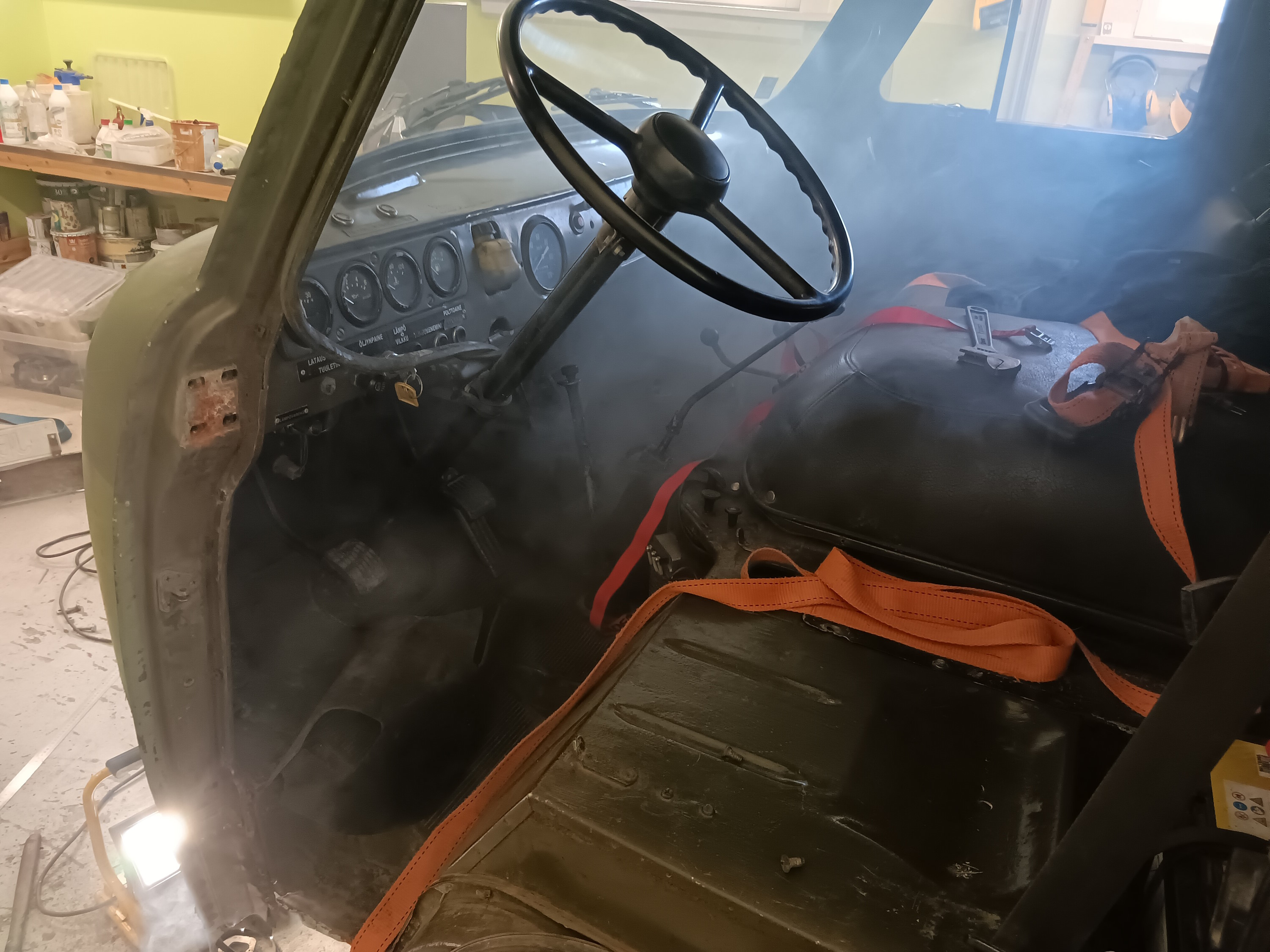 Sivuoven alta helma oli ruostunut puhki joten siihen hitsasin uutta peltiä ja samoilla hitsailuilla sitten rälläköin keulan lommon ympäriltä peltiä pois ja kuskin oven alta vääntyneet pellit pois ja tein ovikynnystä jonkinmatkaa uusiksi. Pieni savu kertoo että Uazissakin on käytetty äänieristettä. Vielä rasvailin tärkeimmät miljoonasta rasvanipasta eli kardaanit ja nivelet ja jotain oleellista jäi varmasti rasvaamattakin. Yhdessä nivelessä tuntui selvästi klappia mutta ei ollutkaan nivel väljä, vaan sehän oli kartiosta irti ja lonksui sen mitä mutteri oli löysässä. Kuuluu vissiin Uazin laatuun että kartio ei nappaa kiinni, kokeilin huvikseni toisella nivelelläkin ja sekään ei tarttunut kiinni. Nyt on kiristetty mutteri taas tiukalle eikä klappia tunnu, mutta pitää kyllä seurata että löystyykö jossain vaiheessa.