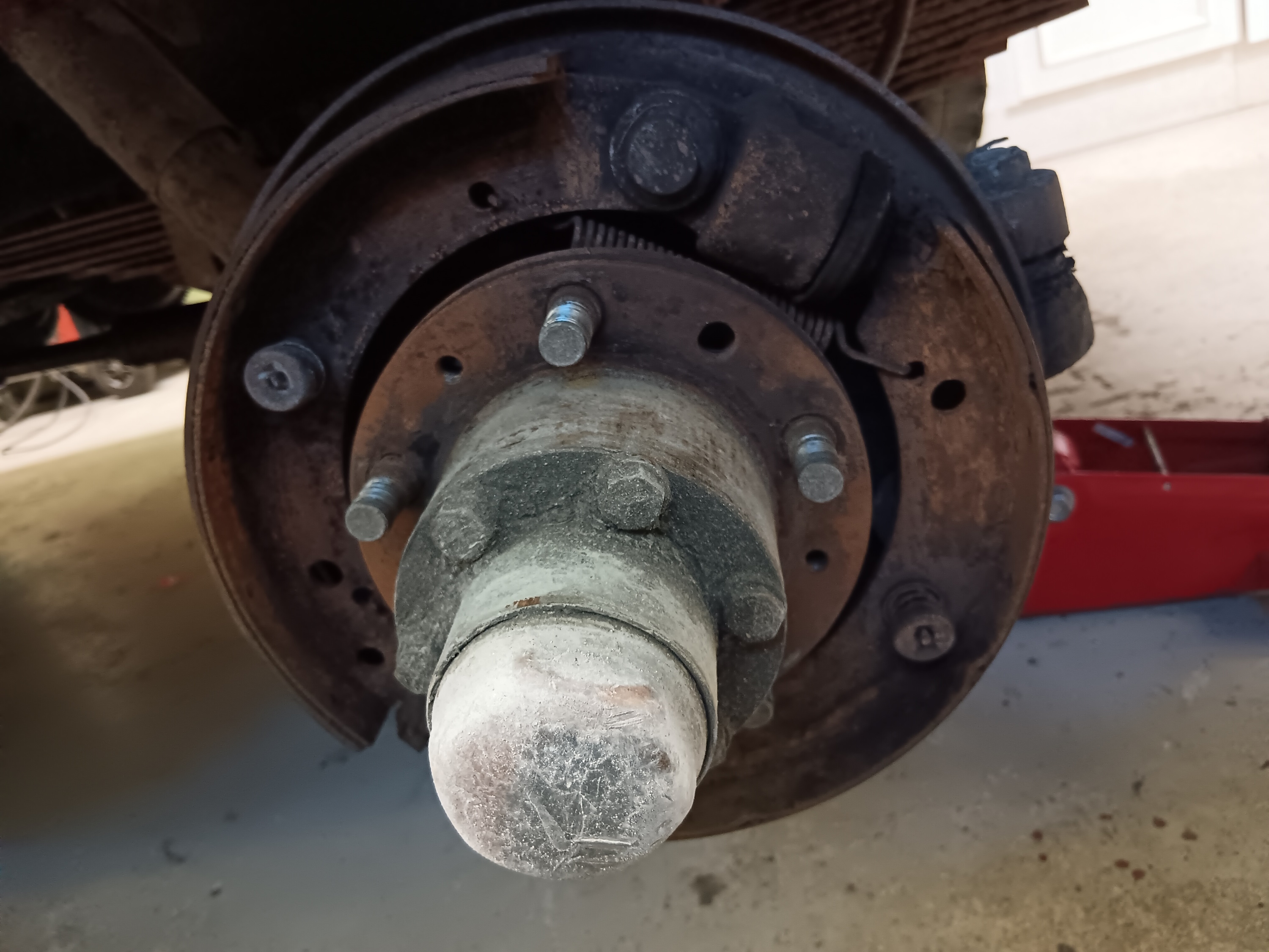 Vähän epäilytti leimansaannin kanssa kun ensimmäisenä käytin jarrurummut auki ja kauhukseni huomasin että etujarruissa on hädintuskin kitkapintaa enää jäljellä ja kitkapintakin tuntui siltä että on irtoamassa. Tiedossahan se kyllä oli kun viimeksi jo oli pinta lähellä loppua ja viimeaikoina on tosiaan tullut ajettua melkoisen paljon. Taka-akselin T-haarasta oli hikoillut puoli säiliöllistä jarrunestettä mutta vuoto asettui kiristämisellä ja varulta ilmasin takajarrut. Käsijarruhan on Uazissa kardaanissa ja se on pitänyt viimeaikoina tosi heikosti, onneksi riitti jarrujen putsaus laatikkoöljystä, kenkien kehintä sekä vaijerin tiukkaus. Kätevää kun ei tarvitse huolehtia jarrun puoltamisesta.