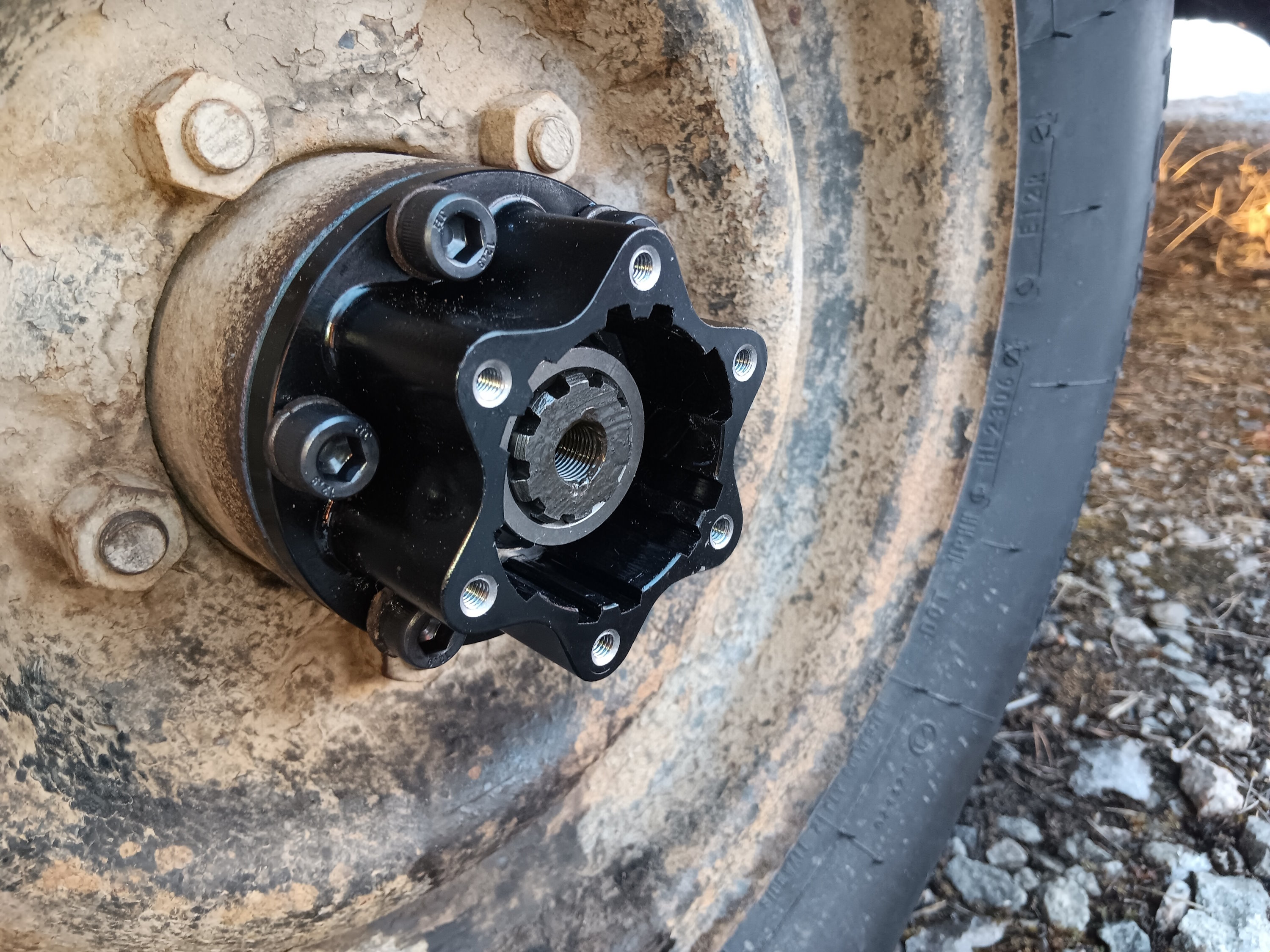 Orkkista irrotettaessa lähti yhdestä pultista kierteet. Kierretapilla sai pelastettua navasta kierteet, että ei tarvinnut kuin etsiä uusi M10 pultti. Paitsi että halusin että on kaikki samannäköisiä ja tässähän oli pultit 14mm kannalla, joita ei pulttikaupastakaan löytynyt. Vakio 17mm kanta on siinä ja siinä että onko niin iso että ei mahdu rengas pois, vaan ahdistaa keskireiästä pultinkantoihin, joten hankin sitten kuusiokolopultteja.