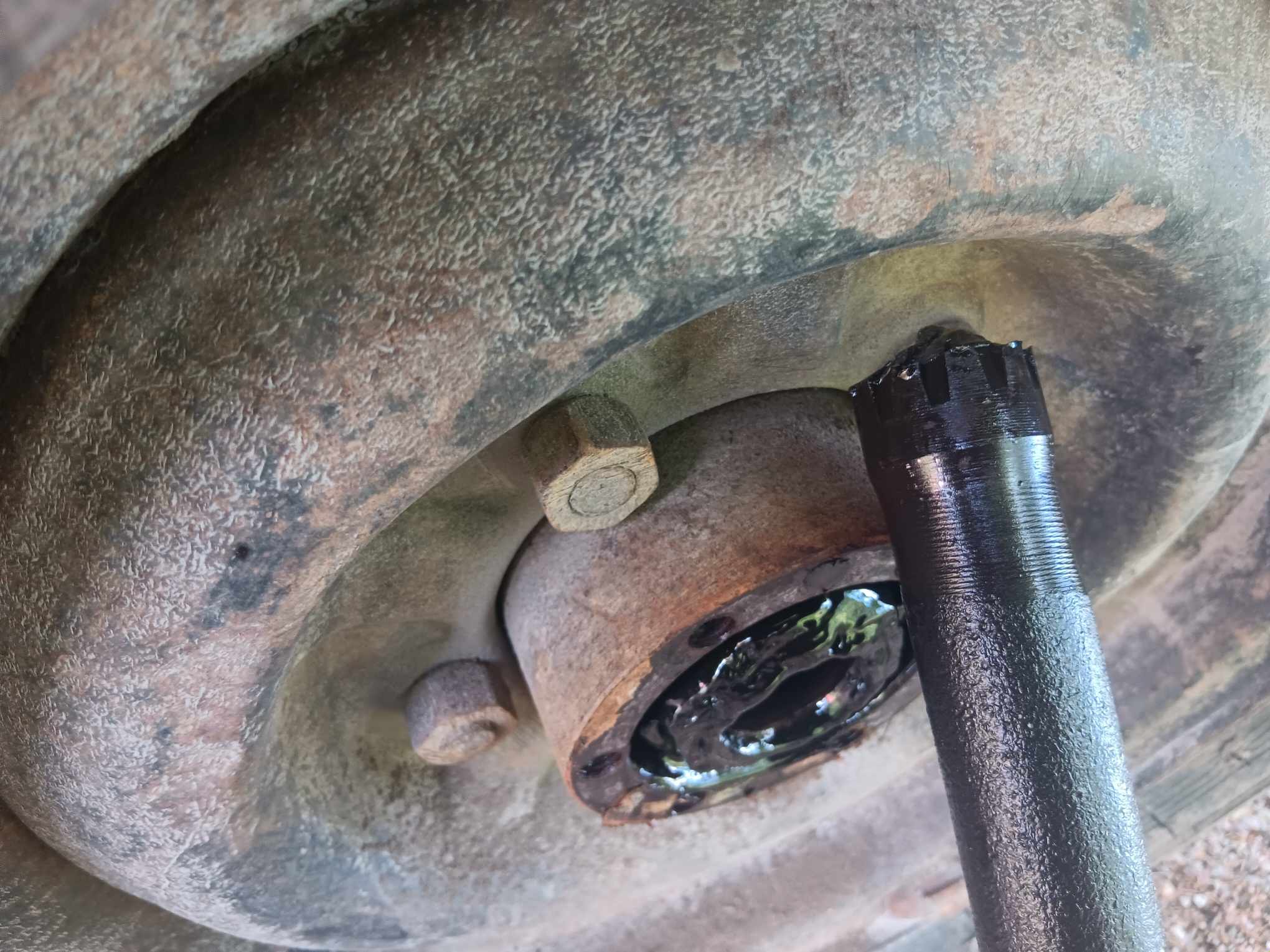 Maassa sitten halkaistiin taka-akseli. Kahta pulttia lukuunottamatta oli läpipultit ja toki toinen pulteista katkesi. Onneksi niin että kun akseli oli katkaistu niin jämää oli sentti näkyvillä ja se induktiokuumentimella punaiseksi niin lähti jämä irti.