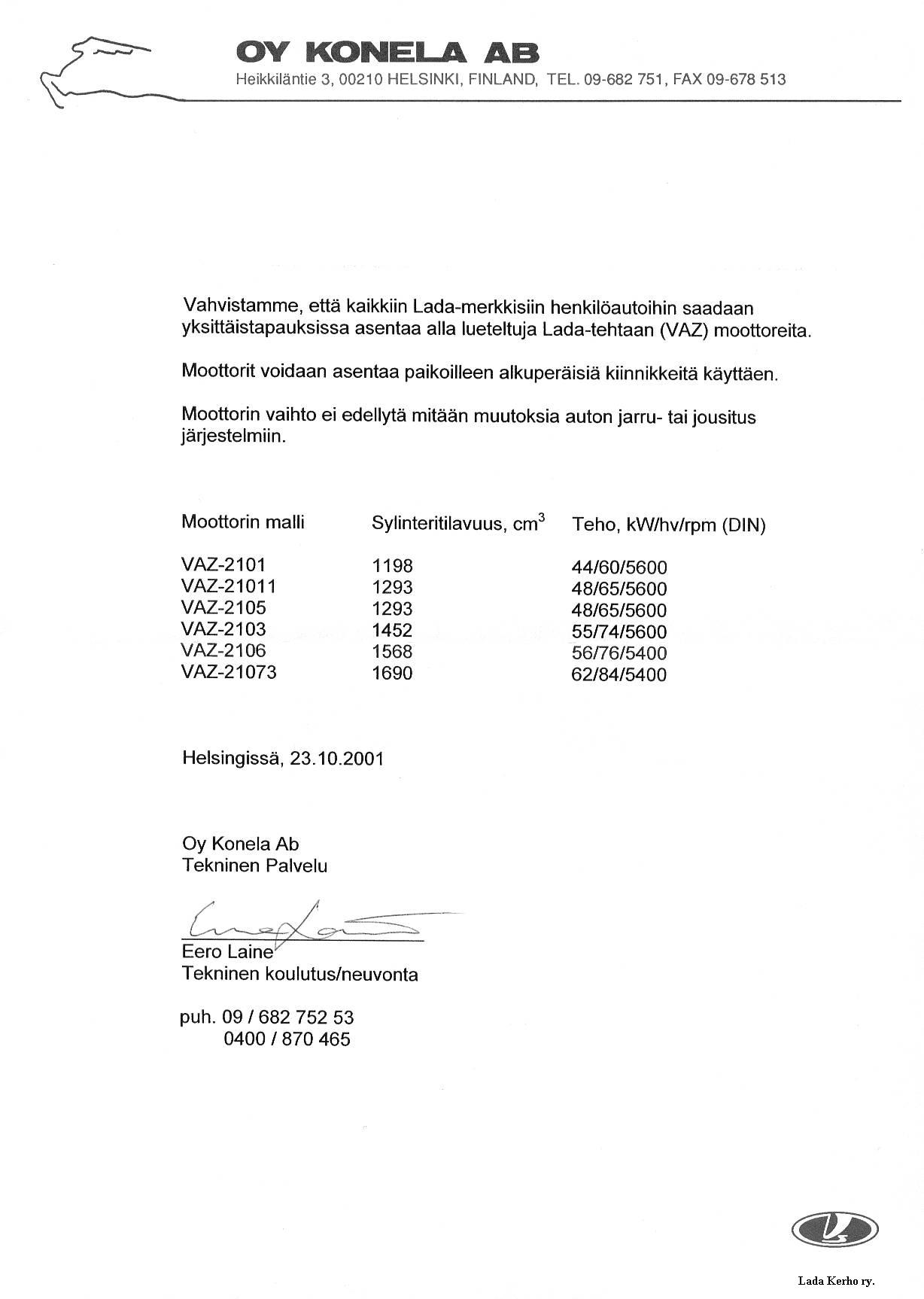 Konelan todistus moottorin vaihtoa varten.