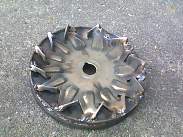 Kuten kerholehdem jutttuun laitoin: Vesipumpun pyörä. Kuppi pois "sorvilla". hitsillä kiinni siipiin. Toimiii...