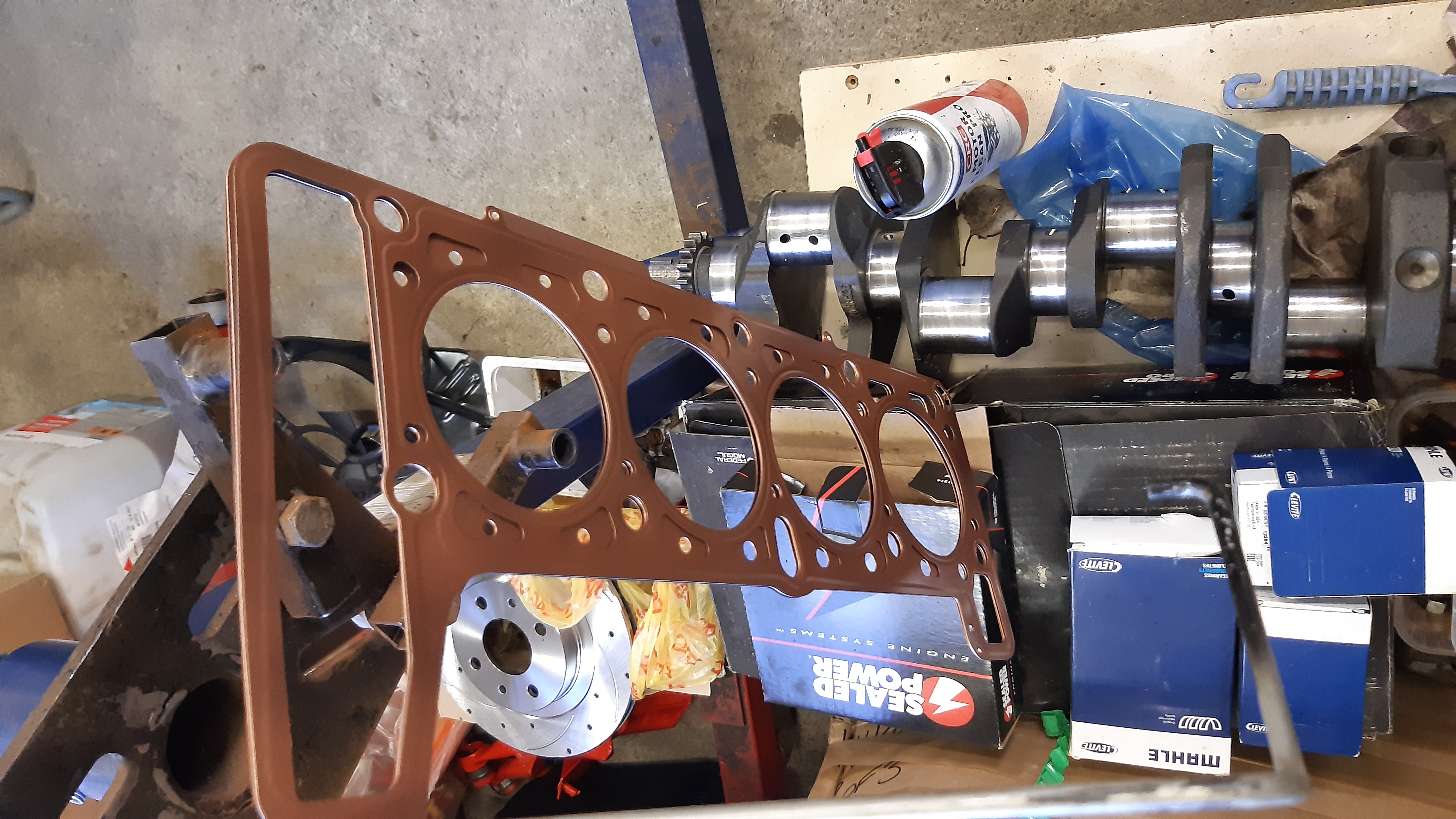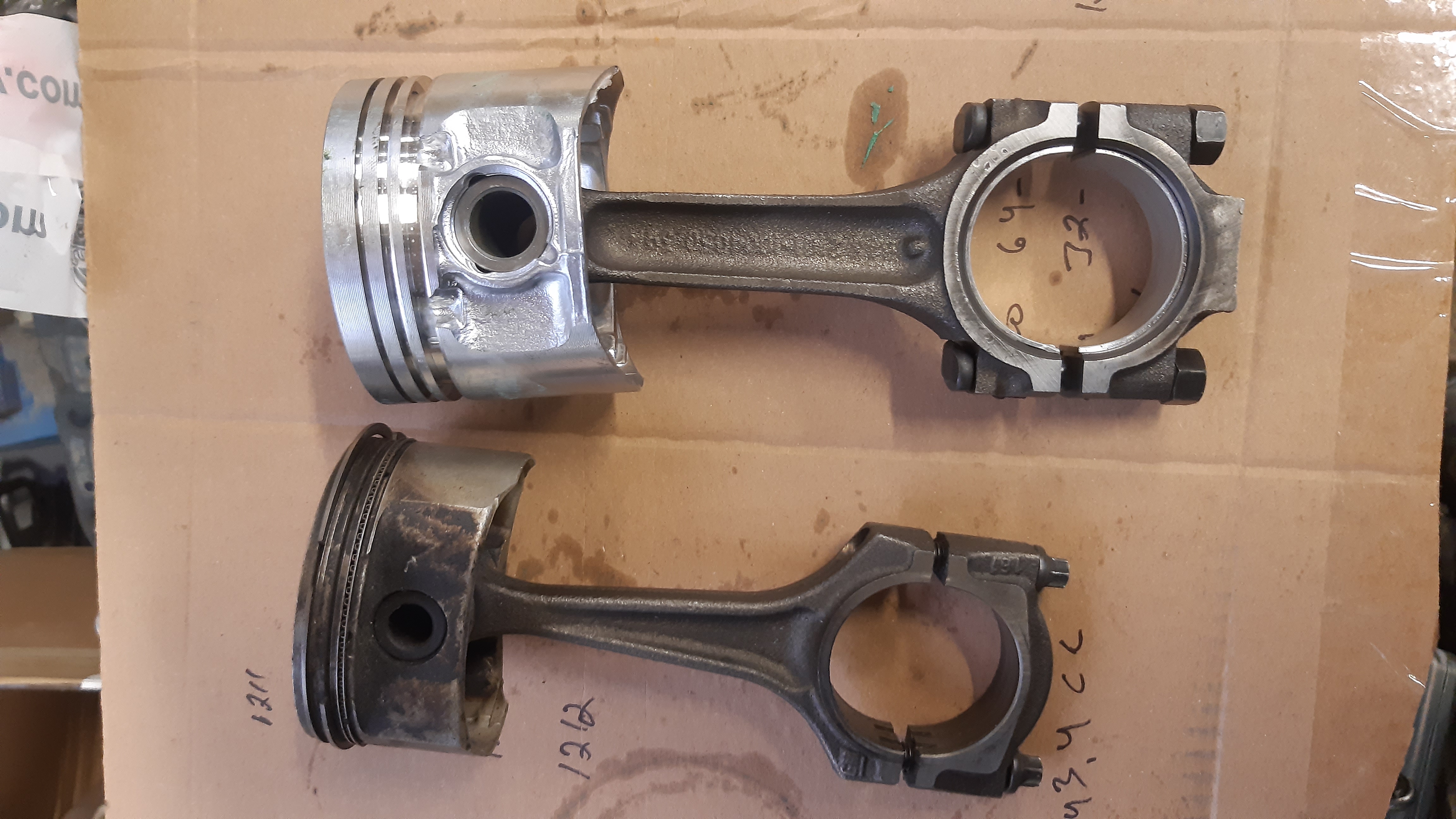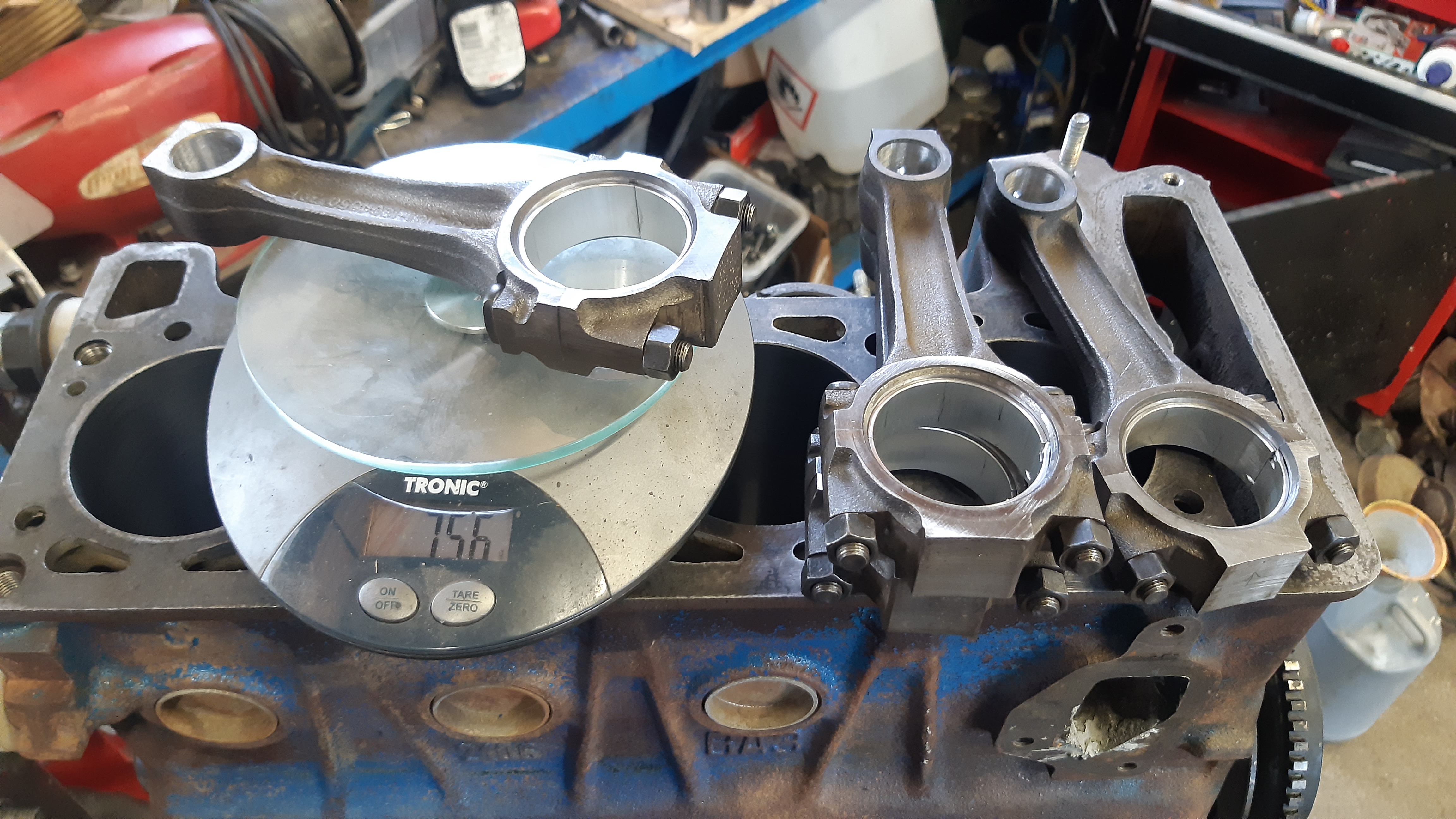 Tuossa muuten vertailuks opelin 1,8 pikkulohkon mäntä/veivi paketti ladan kamojen vieressä. Vain puoli kiloo painoeroa