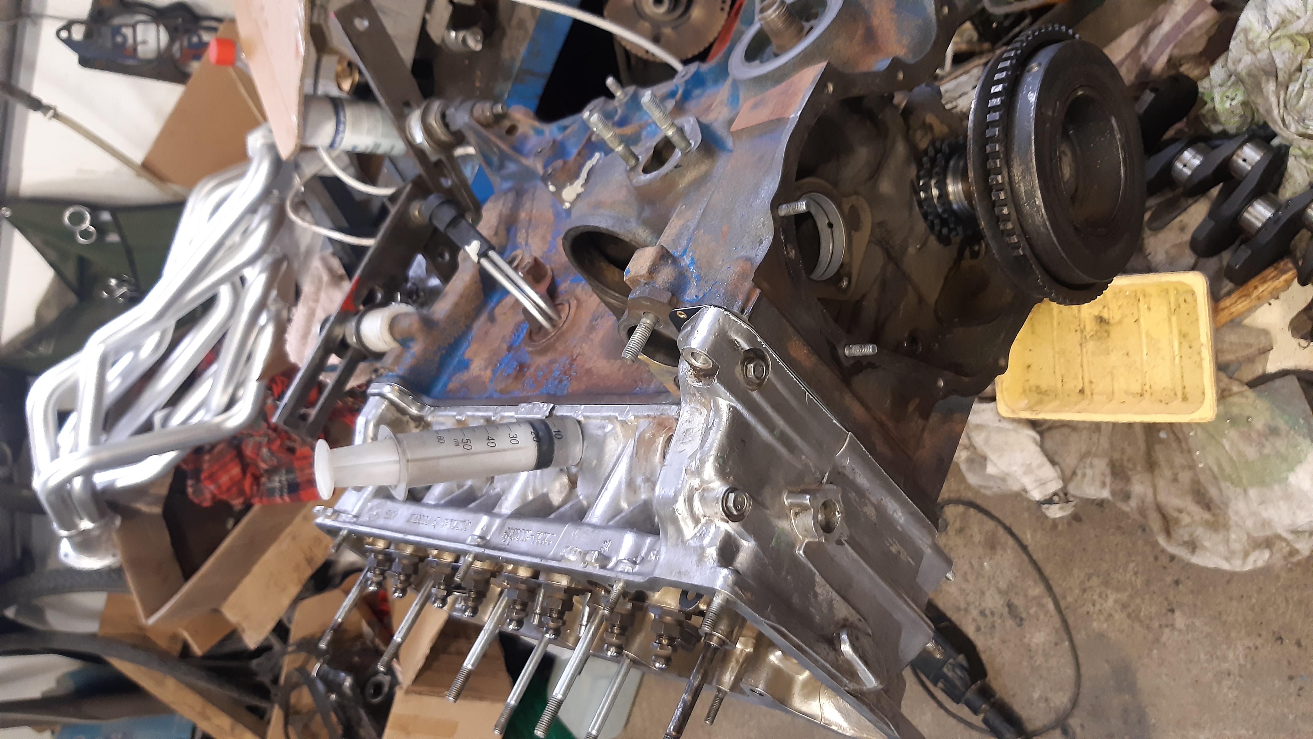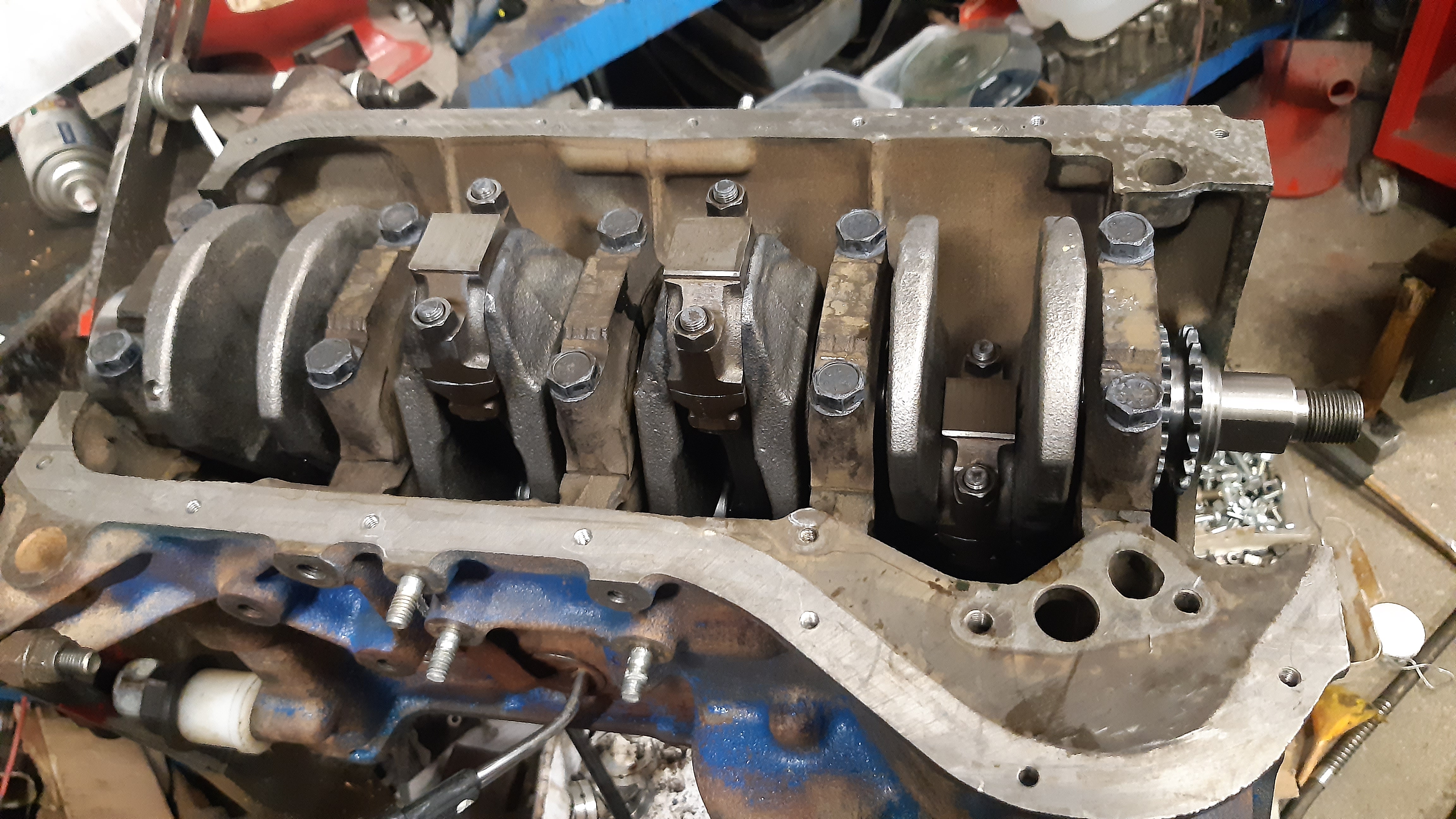 Eilen illalla kerkesin sen verran talliin, että putsailin lohkon ja pyörivät osat. Kasausrasvaa laakereihin ja kampura paikalleen ja pultit momenttiin. Sama homma männille.