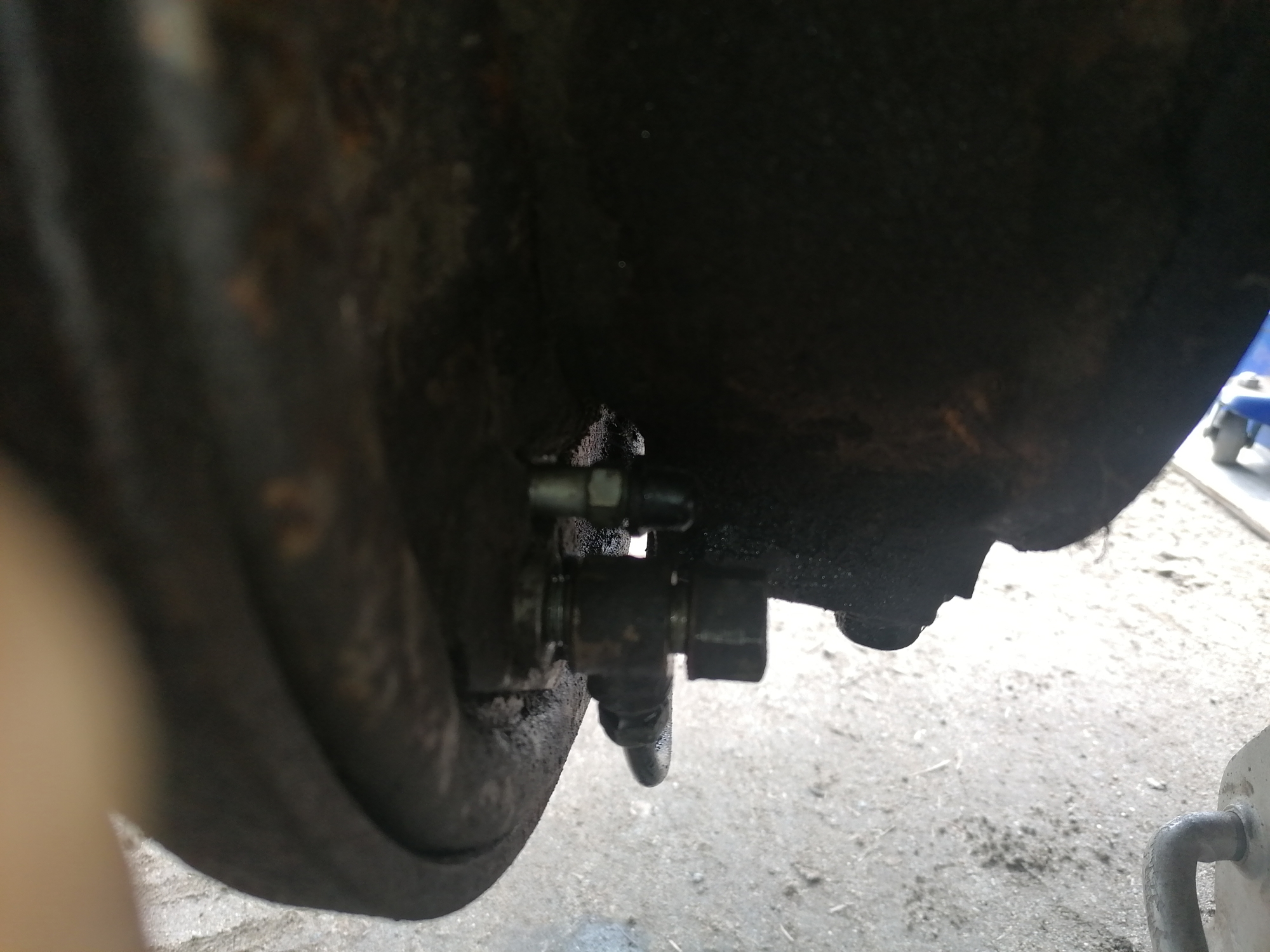 Epäilykset osuivat takajarruletkuun. Sitten alkoi tämän päivän vastoinkäymiset. Vaikka useana päivänä olin wd:tä suihkinut kaikkiin jarruliitoksiin niin nyt löytyi ensimmäinen liitos mikä ei meinannut aueta. Jarrruputki lähti pyörimään mutterin mukana mutta tajusin sitten alkaa pyörittämään letkua jolloin liitoksen sai auki ja putki säilyi ehjänä. Sittenpä sen mutterinkin saikin herkisteltyä pyörimään. Ja letku oli tukossa niinkuin arvelinkin.