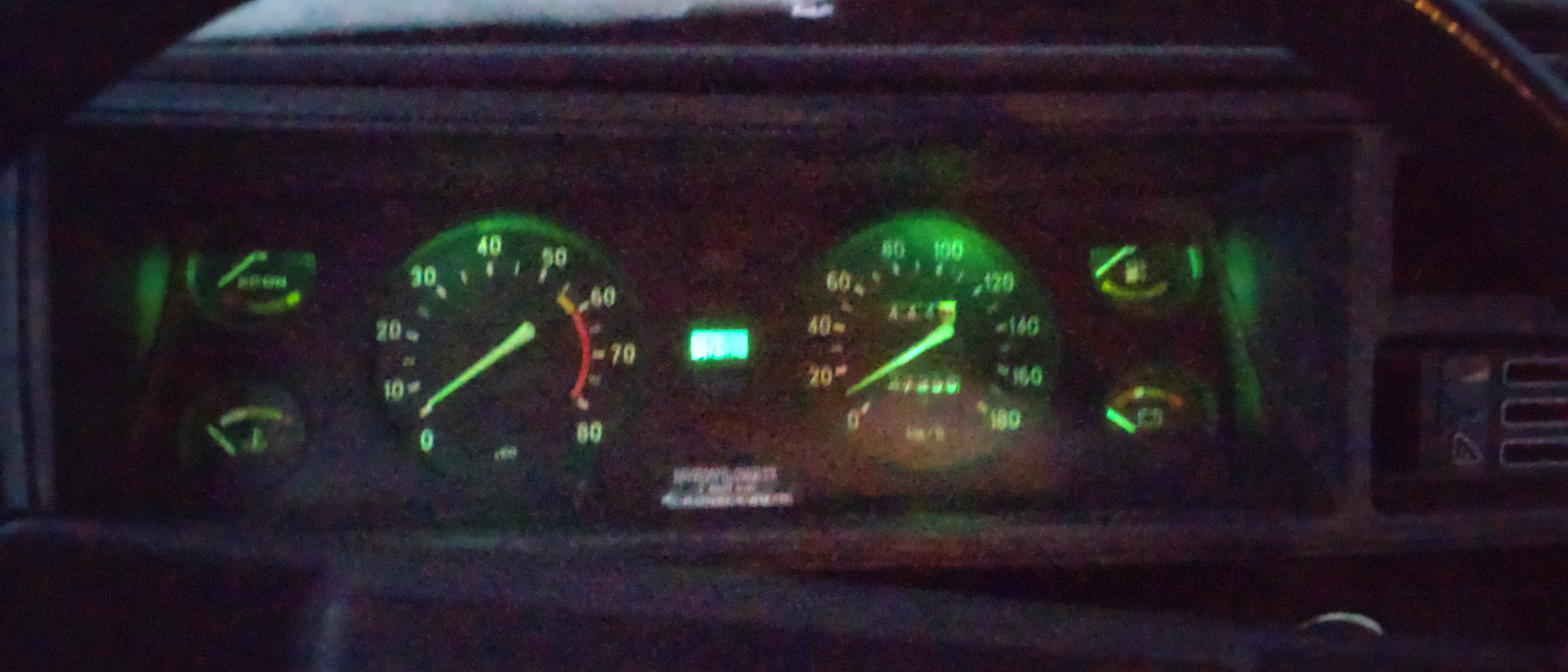Virrat päällä paloi öljynpainevalo ja laturin merkkivalo. Hyvä homma siis. Muuten mittaristo oli mykkä. Latausmittarikin näytti nollaa eikä econikaan liikahtanut, Samoin kierroslukumittari oli hiljaa. Sulakkeet näyttivät ihan ehjiltä ja nopeasti pyöräyttelin niitä, mutta apua ei ollut. Puhallin oli mykkä, ja lisäksi tässä lienee jonkinlainen valojen varoitussummeri asennettu, koska jokin ulina kuului virrat pois päältä ja ajovalot päällä. Puhaltimen kytkimen naksuttelu muutti kyseisen äänen voimakkuutta. Pitääpä siis selvitellä hieman sähköasioita. Valojen pesimetkin pitivät ainakin ääntä, joten jotain sielläkin tapahtuu. Radiokin toimii ja sieltä tuli heti propagandaa, kun ruuvasi taajuuden kohdalleen. Alku lupaa siis hyvää.