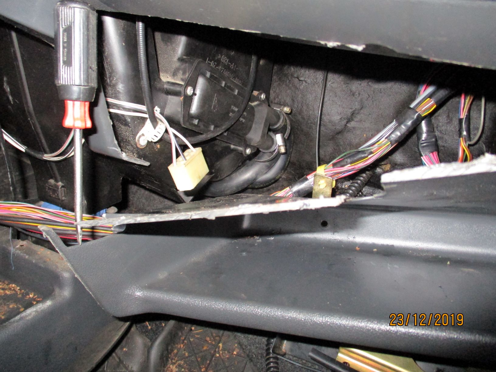 Tuli mieleen, että voisin käydä katsastamassa tämän ajopelin. Varasin ajan ja sitten menin tutkimaan, että kaikki pelaa. Käsijarru ei ottanut yhtään kuskin puolella. Laitoin uudet vaijerit. Sitten vielä viimeinen silmäys pohjaan, ettei ole mitään reikää. Perkules, menin sörkkimään palkkia oikealla takana pyöränkotelossa. Siinä on joku 8mm metalliputki, oisko bensaputki? Sen alle oli kertynyt rapaa ja niin oli reikä syntynyt. Ei tullut katsastamisesta mitään. Peruin ajan. Kabiinissa lämmönsäätimien kehikko oli hieman painunut. Kun irrotin sen kotelon, koko säätöhässäkkä irtosi autosta ja molemmat korvakkeet on poikki. Kyllä säätämistä piisaa... Pitää siirtää remontit kevääseen, silloin ruuvausintoa piisaa paremmin.