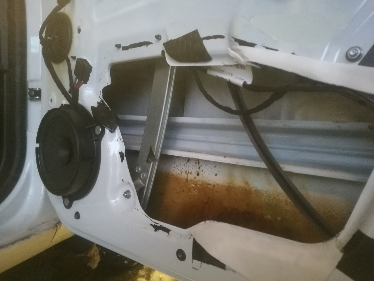 Tässä vaiheessa oli tietty hyvä hetki kurkata ja katsoa miten runsaasti ruosteenestokäsittelyssä oviin ruiskutetaan kotelosuojaa.