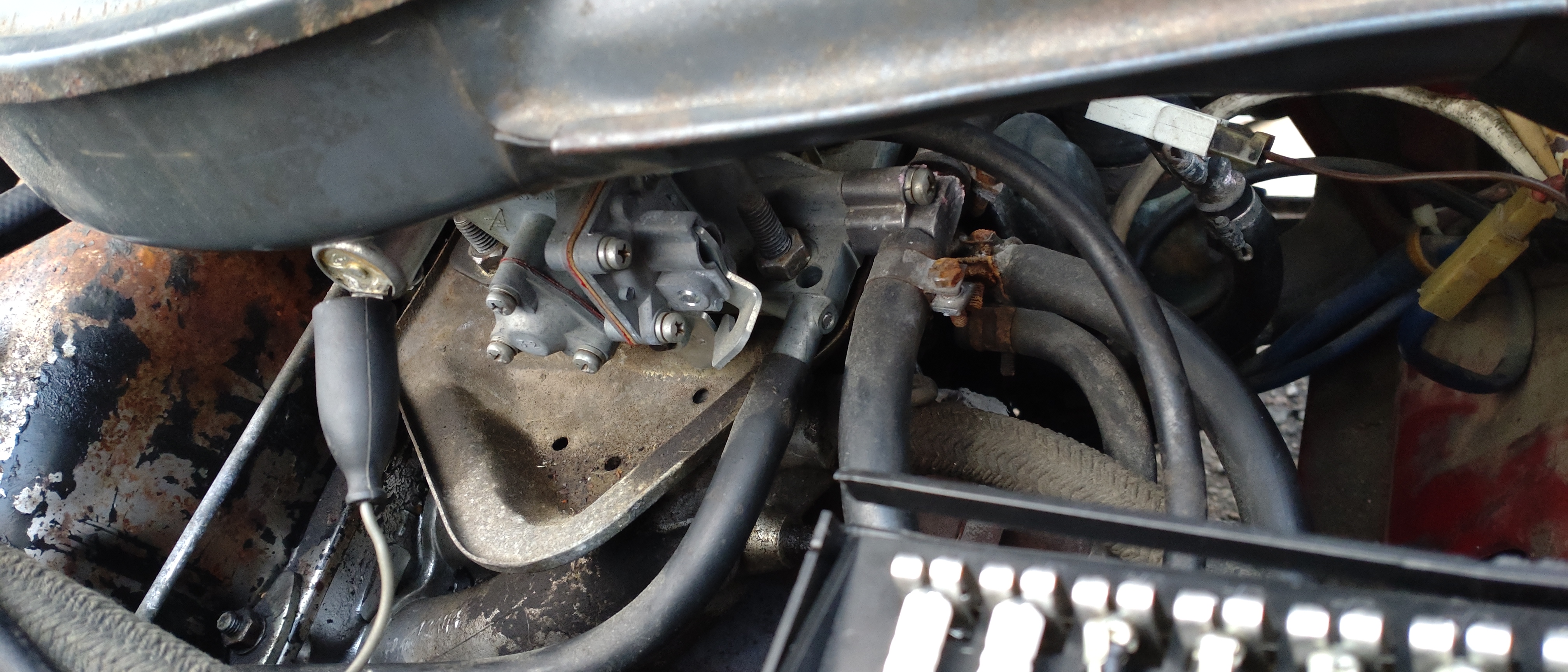 Tekniikka on muuten mainion oloista, mutta Ladassa oli mittaristo pimeänä ja kymppisulake paloi koko ajan. Lisäksi siihen oli vaihdettu axteckin tilalle Samaratyylinen takavedon Solex. Onneksi Axtec-kaasari oli takakontissa mukana. Jarrut tarvitsivat hieman huomiota sekä muutama pieni reikä pitää paikata. Pakoputkea pitää justeerata oikeaan asentoon ja tässä on jostain syystä Combin takapönttö. Muuten tämä on erittäin tervekorinen ja vaikuttaa napakalta. Konetilassa on muuten joku omituinen liitin. Osaako joku kertoa, mikä se voisi olla? Se näkyy yhdessä kuvassa.